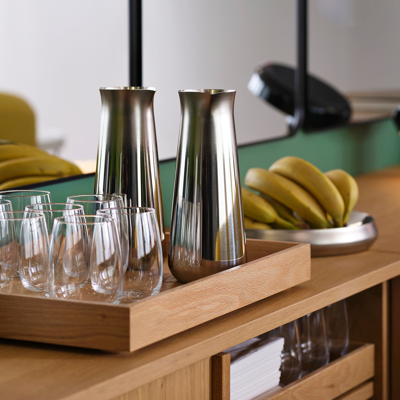 Sleek steel carafe for water and cold drinks. So timeless, forgetting it on the table is perfectly fine.