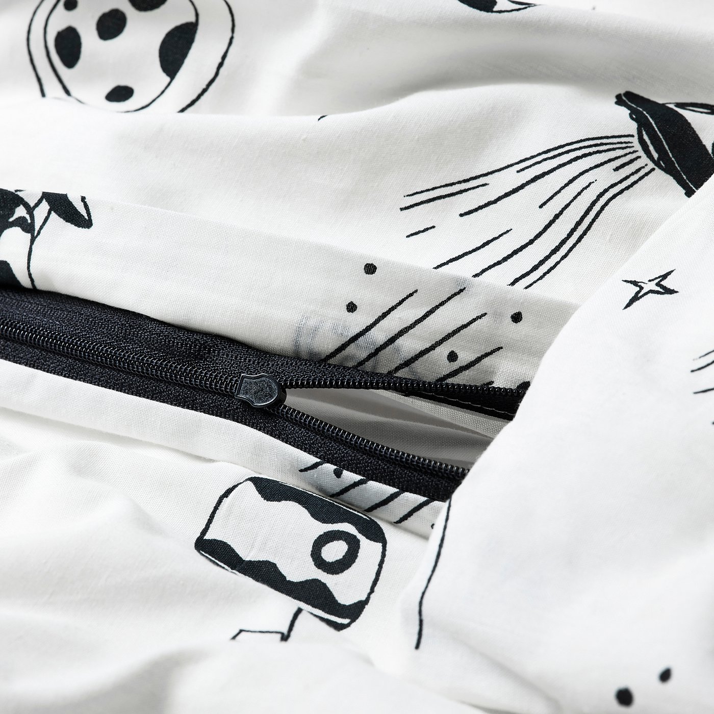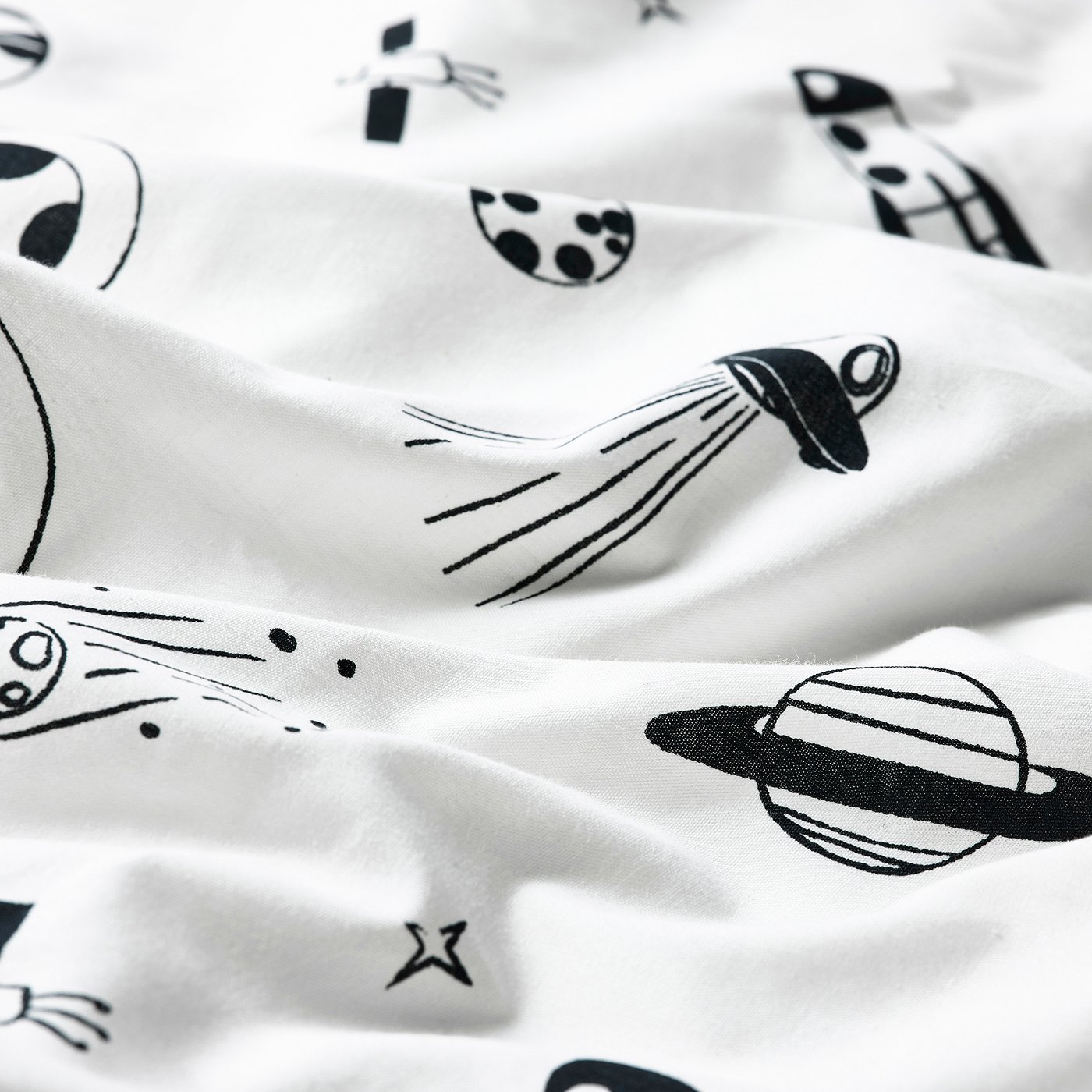 Patterned with black spaceships and rockets amongst planets, moons and stars, this white cotton/viscose duvet cover is on a mission – to make a children’s bed cozy. A dream for little astronauts.