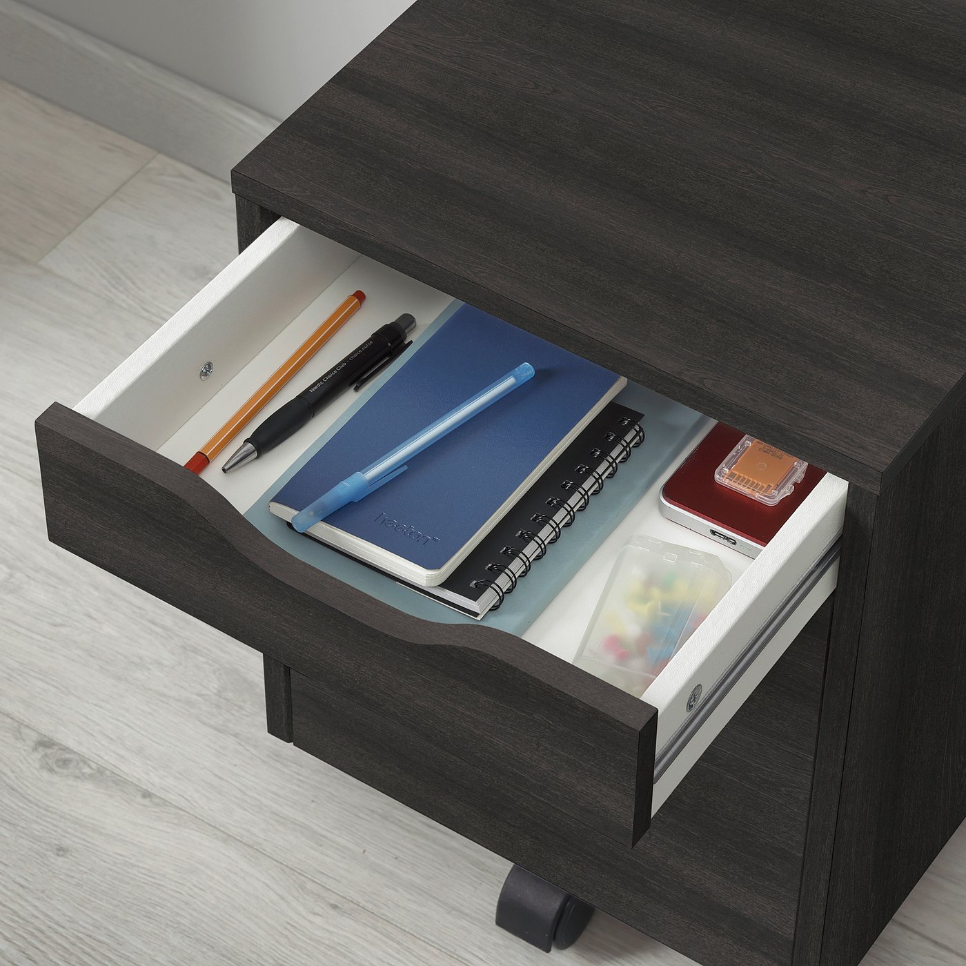 The top drawer can be used for storing pens and other small things, and the bottom one for larger things.
