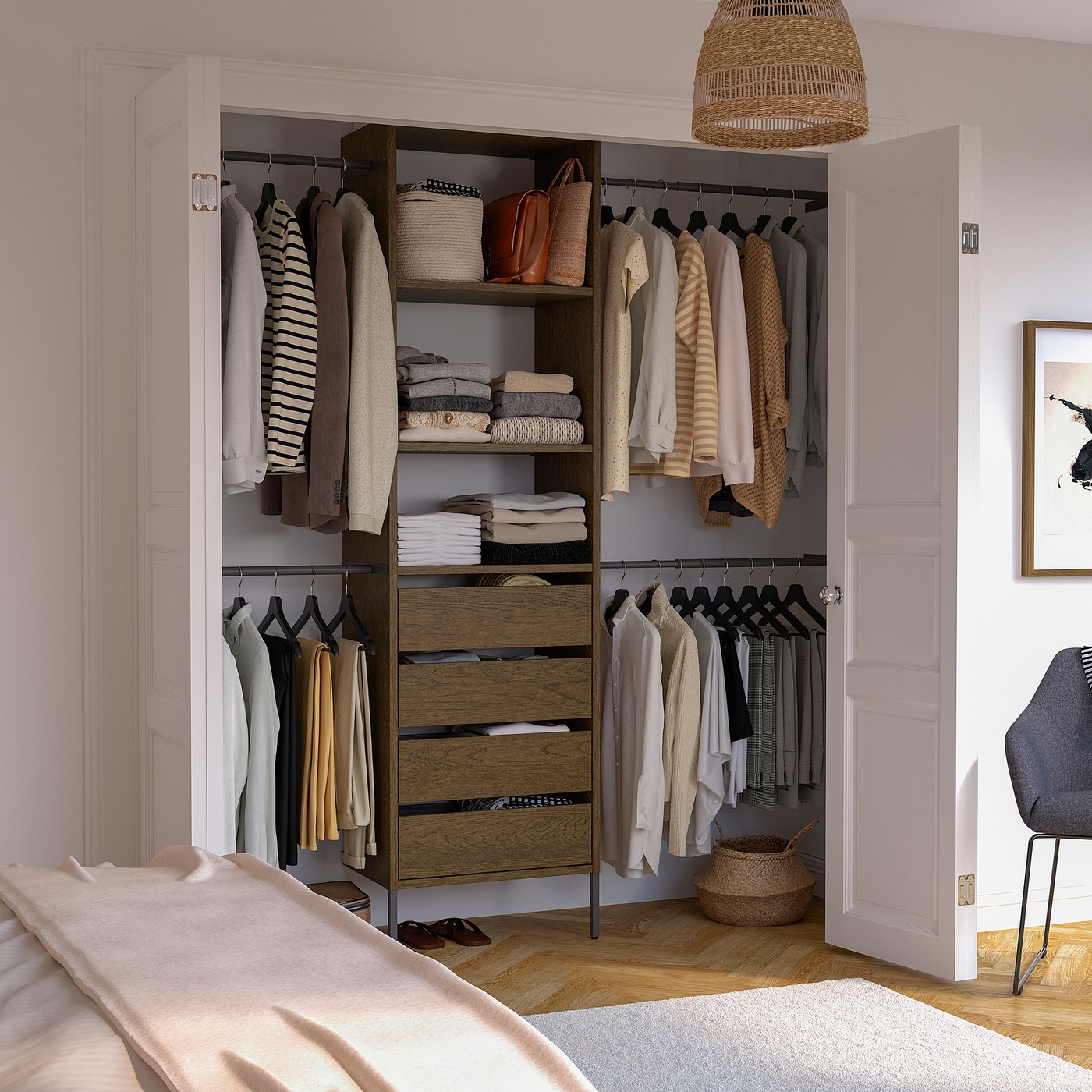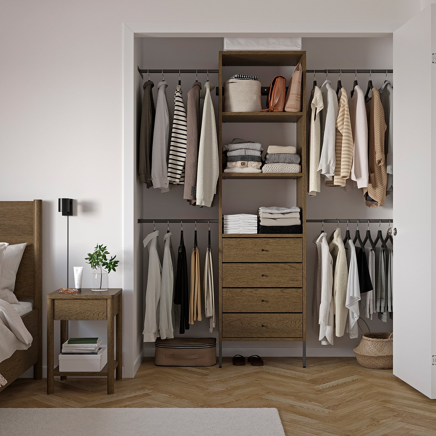 With AURDAL storage system, you can customize a solution for any reach-in or walk-in closet. Beautifully brushed veneer gives a tactile finish with a distinct sense of wood.