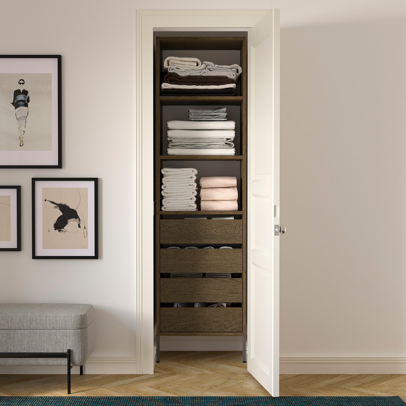 With AURDAL storage system, you can customize a solution for any reach-in or walk-in closet. Beautifully brushed veneer gives a tactile finish with a distinct sense of wood.