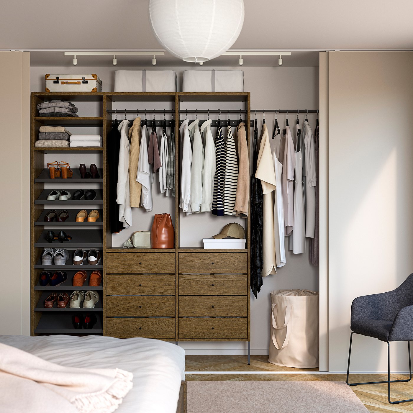 With AURDAL storage system, you can customize a solution for any reach-in or walk-in closet. Beautifully brushed veneer gives a tactile finish with a distinct sense of wood.