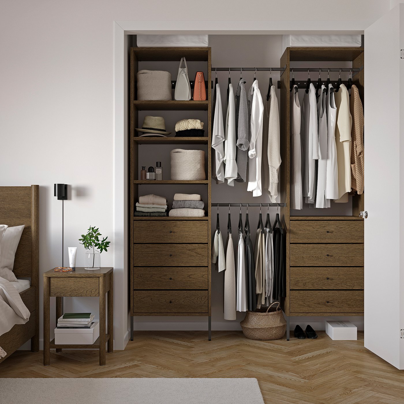With AURDAL storage system, you can customize a solution for any reach-in or walk-in closet. Beautifully brushed veneer gives a tactile finish with a distinct sense of wood.