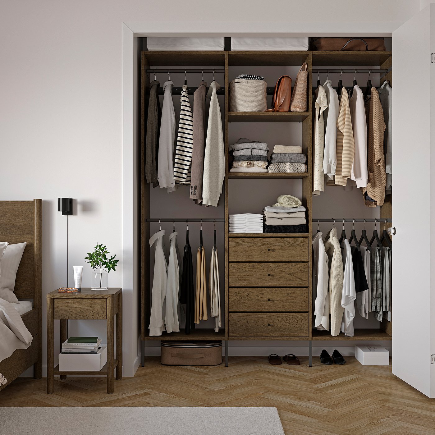 With AURDAL storage system, you can customize a solution for any reach-in or walk-in closet. Beautifully brushed veneer gives a tactile finish with a distinct sense of wood.