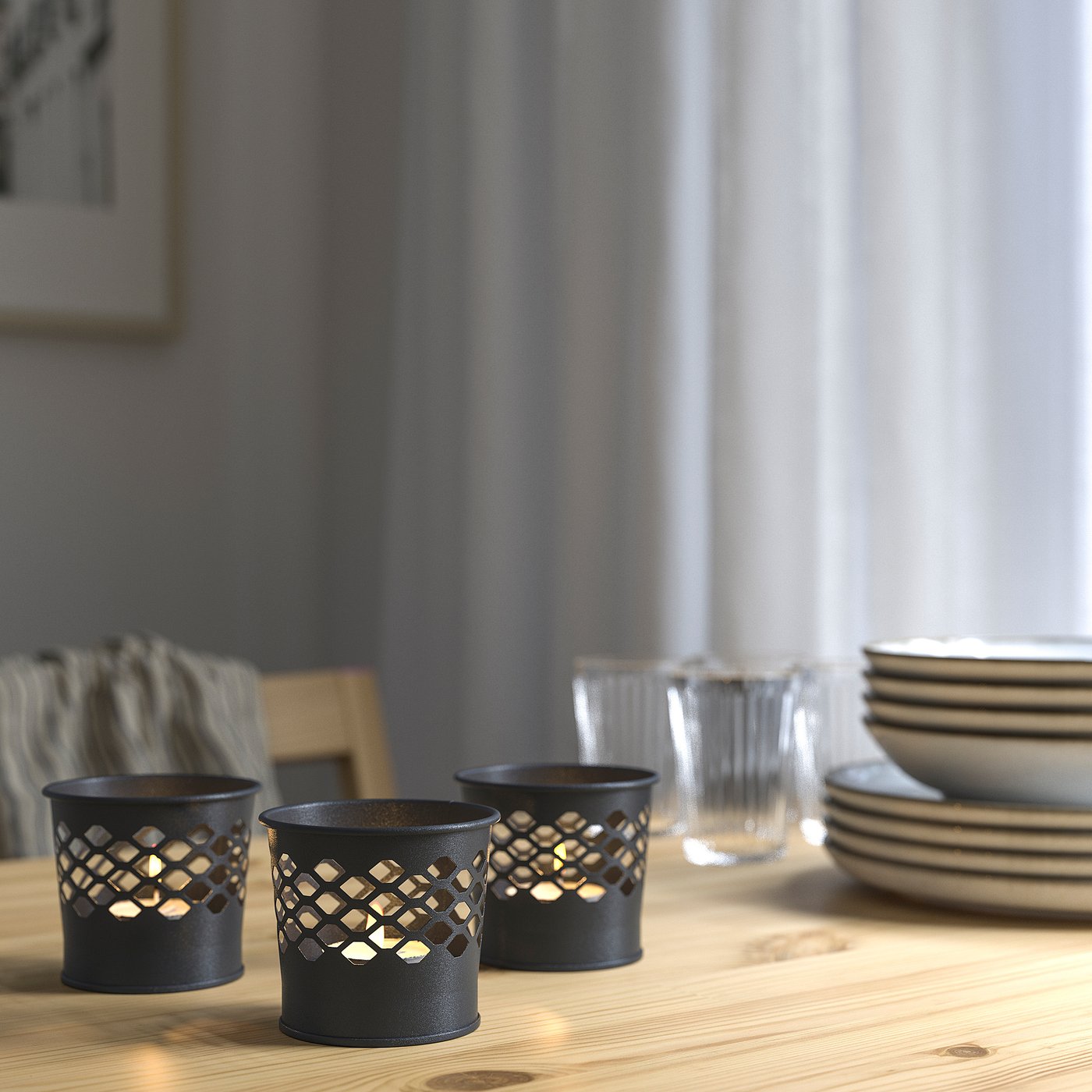 The candlelight shines through the cutout metal and creates decorative patterns and a cozy atmosphere.