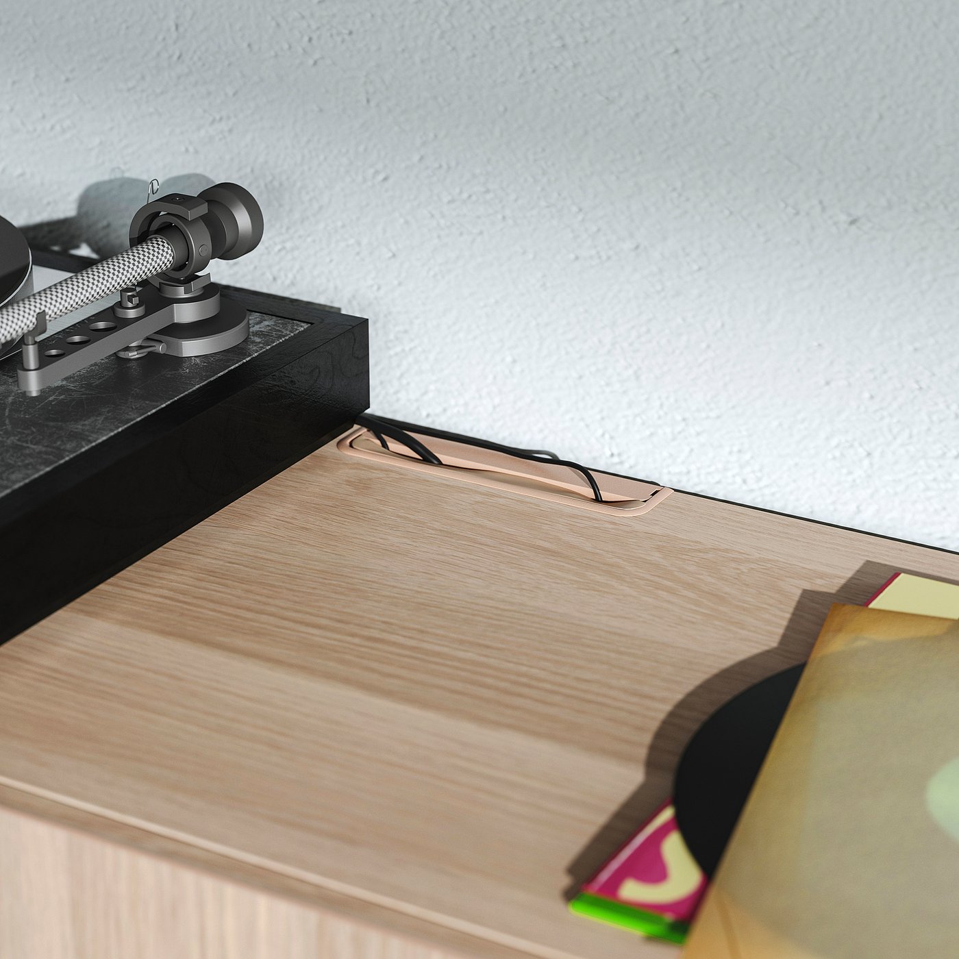 Sleek and practical storage with cable outlets to avoid clutter. The mix of wood expressions creates a natural, modern and warm look. A great fit for rooms throughout the home!