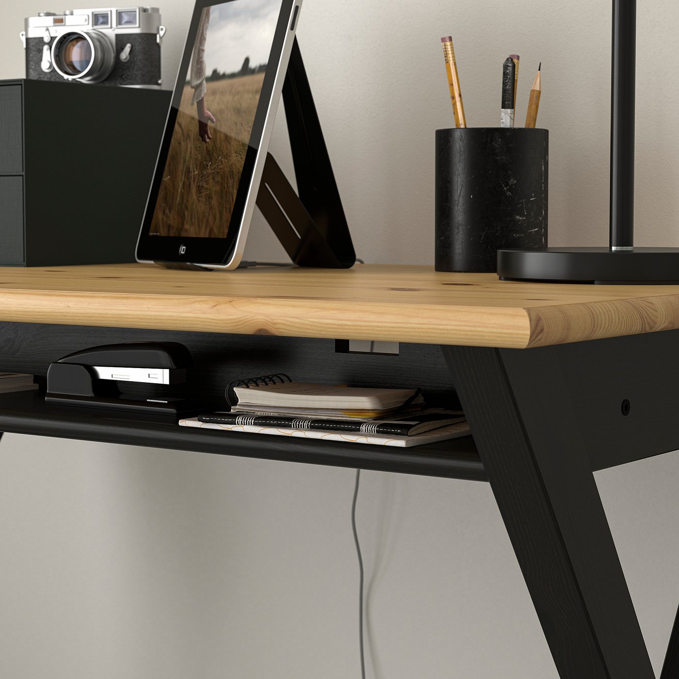 A stylish nod to traditional design. BOLLPOJKE desk has a tabletop made of beautiful blonde wood with an open shelf underneath and discreet cable management. Perfect for elevating your home space!