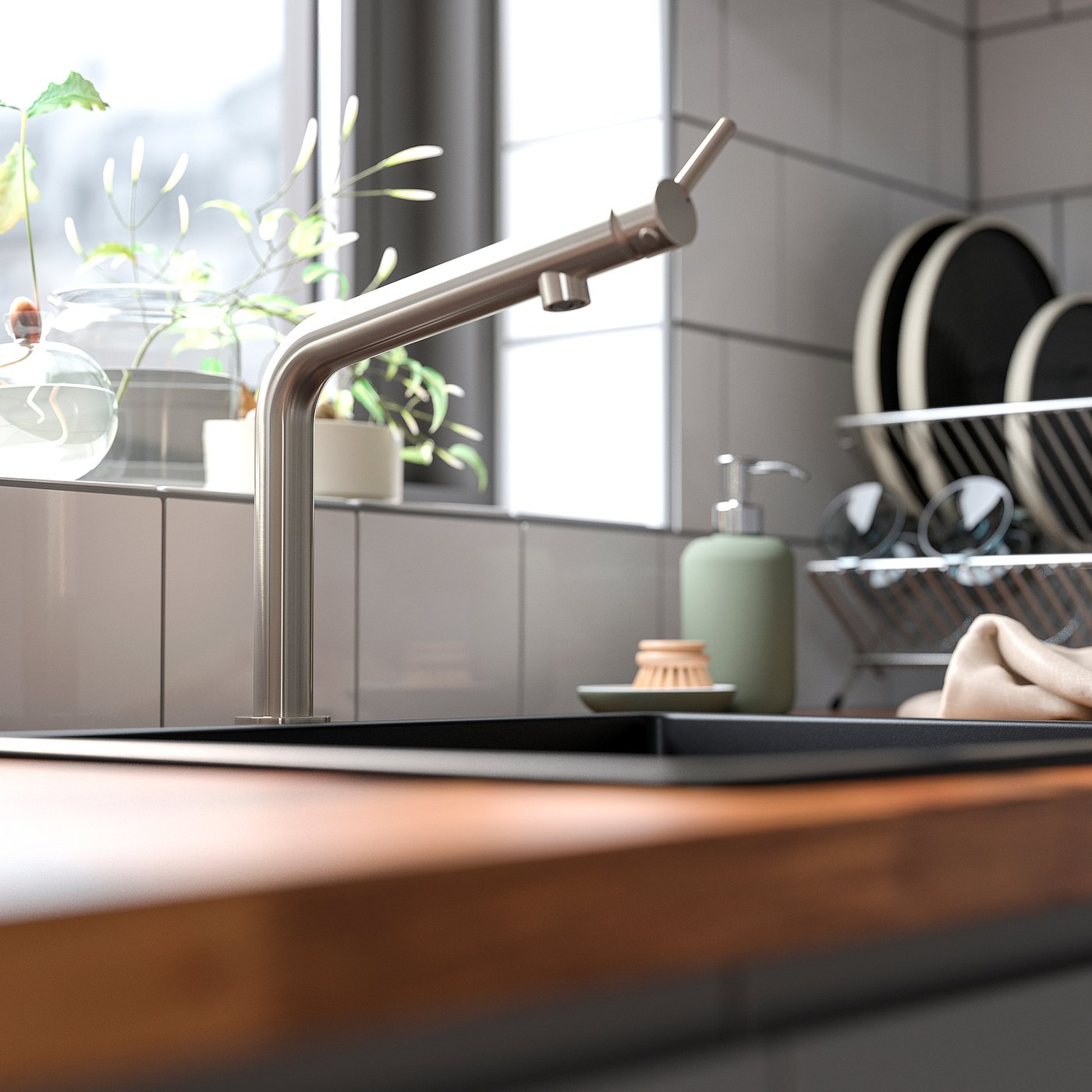BOSJÖN faucet in stainless steel helps lower water- and energy-use – so you can lower your bills too. The quality is guaranteed to outlast many years of pouring, washing and rinsing.