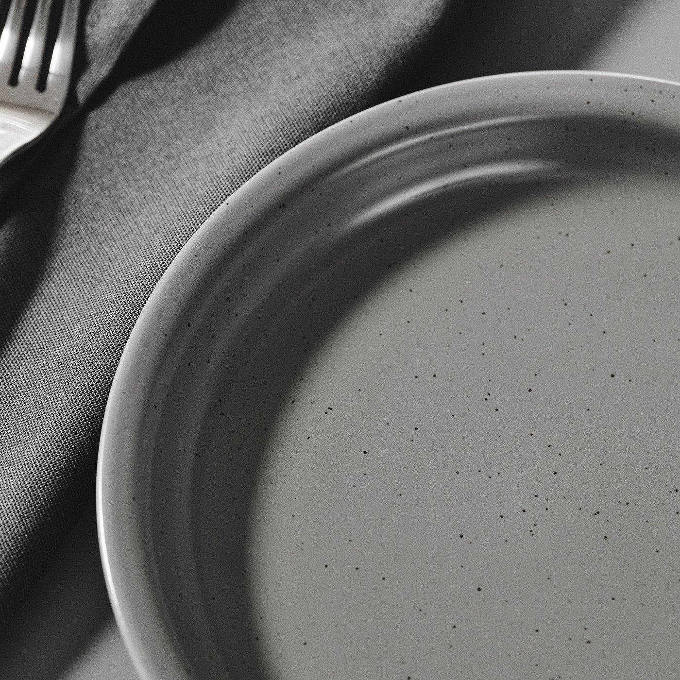 Rustic stoneware in a gray, semi-matte finish with irregular speckles that create a lively and genuine expression.