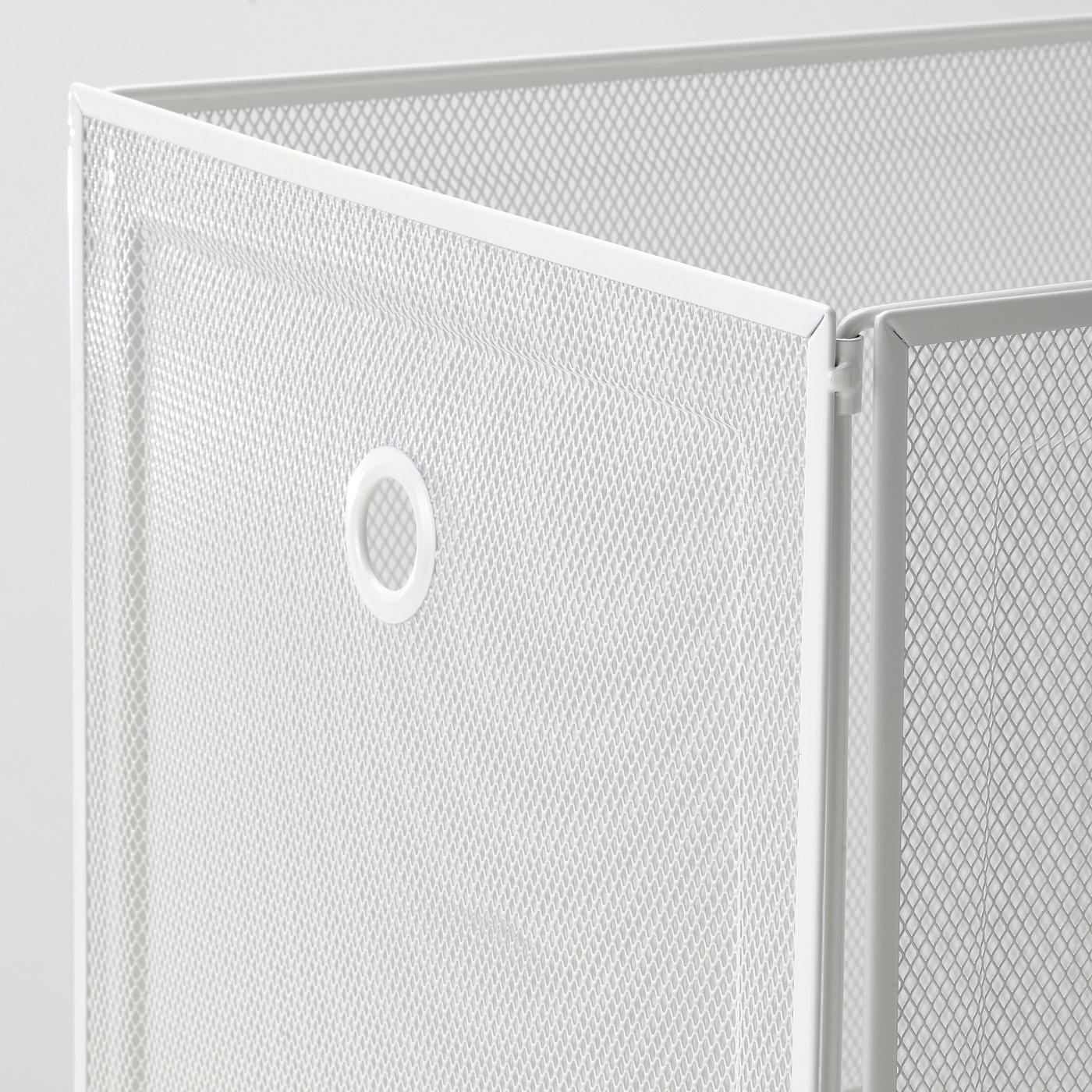 This storage box in white metal makes it easy to keep your things organised and tidy. The mesh net lets you glimpse what’s inside and the size fits perfectly in KALLAX shelving unit.