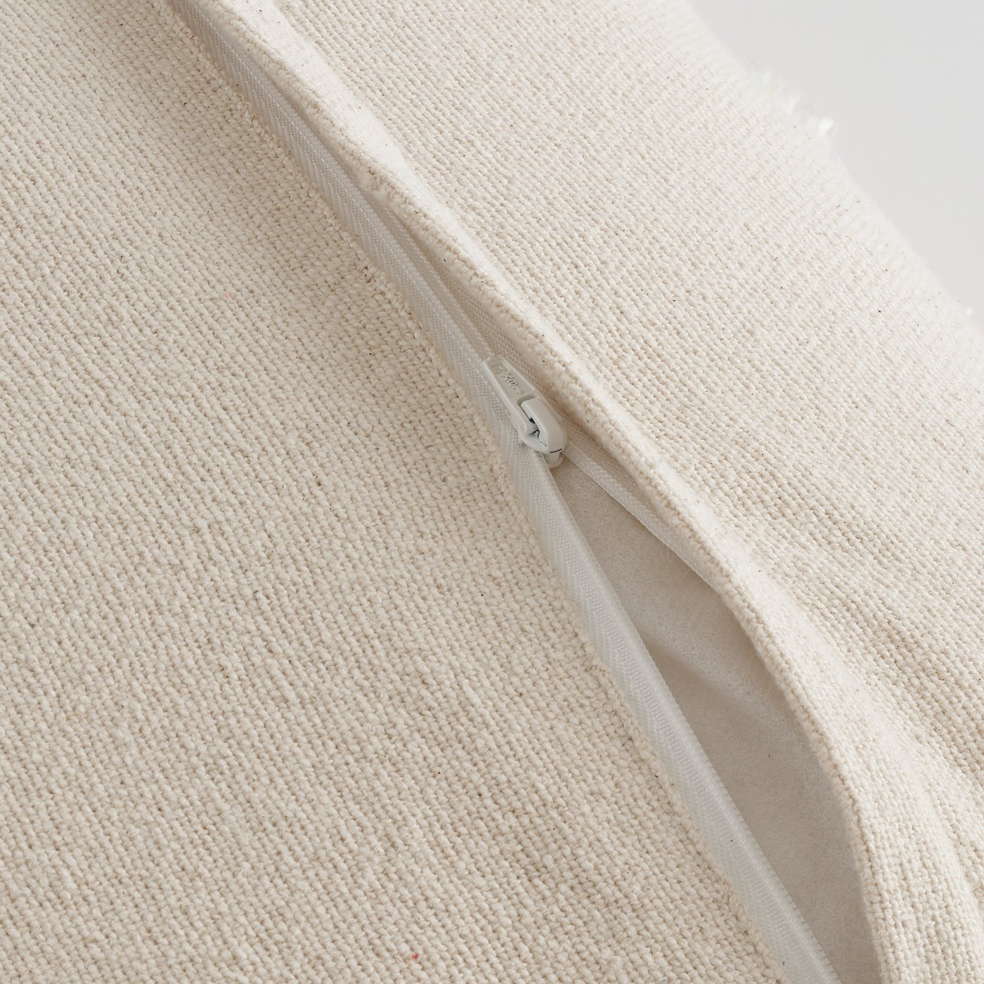 White tiny loops come together to create a geometric pattern on this natural-colored cushion cover in a boho style. Made of soft cotton, decorative to look at and easy to remove and wash.