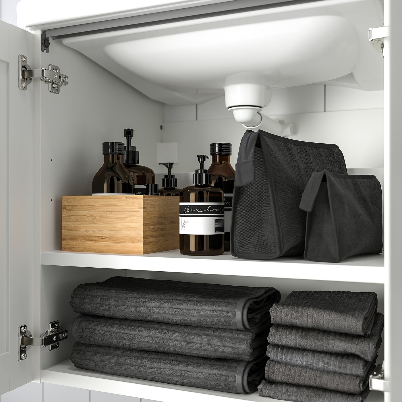 ENHET series makes it easy to start fresh with a new bathroom solution. This base cabinet for sink with shelf keeps towels handy and the timeless white framed door goes with any style.