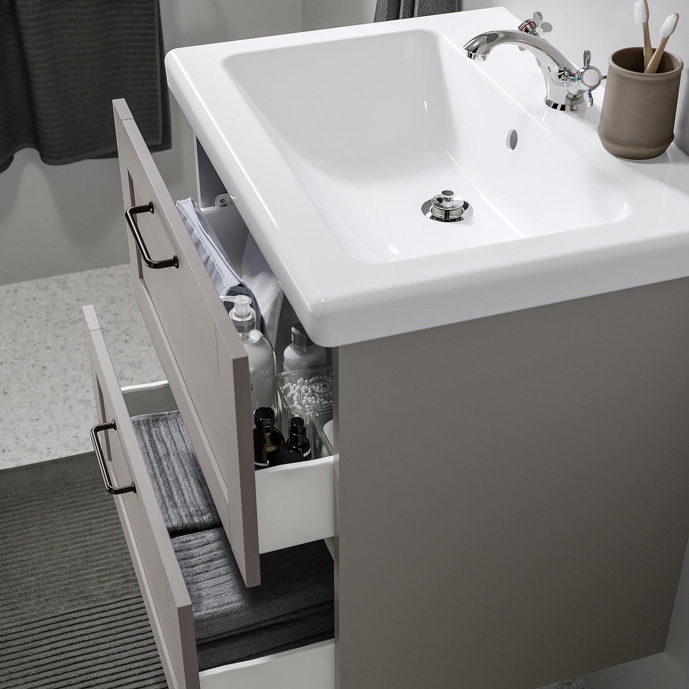 ENHET series makes it easy to start fresh with a new bathroom solution. This base cabinet for sink has 2 handy drawers for essentials, and grey framed fronts that feel warm and inviting.