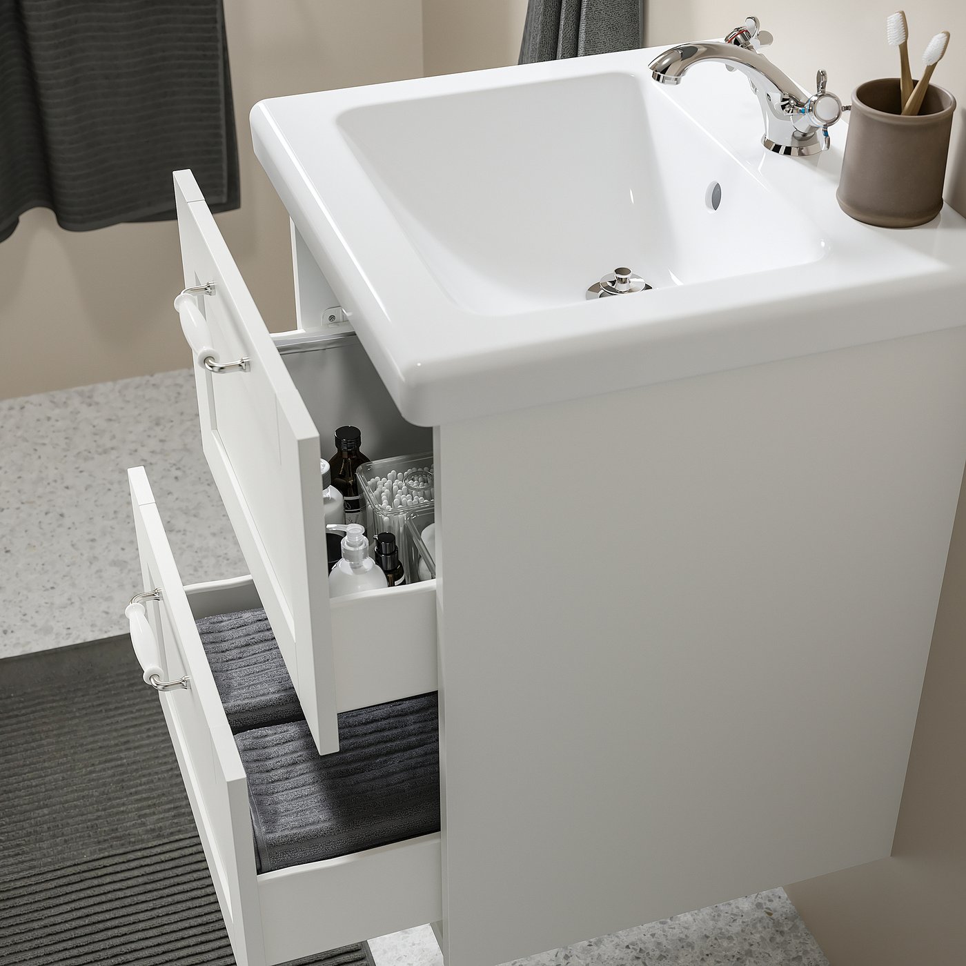 You can store often-used things like cotton pads, brushes and hygiene products in the top drawer, and other things like towels the bottom drawer.