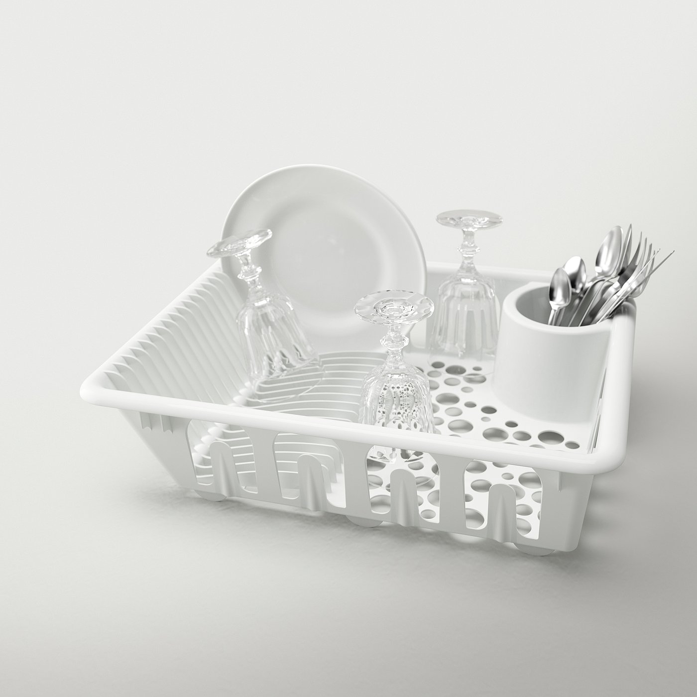 This dish drainer holds plates, bowls, cups and cutlery. You can even fix 9 glasses in place on the outside! And it´s simple to move if you need the surface for something else while things are drying.
