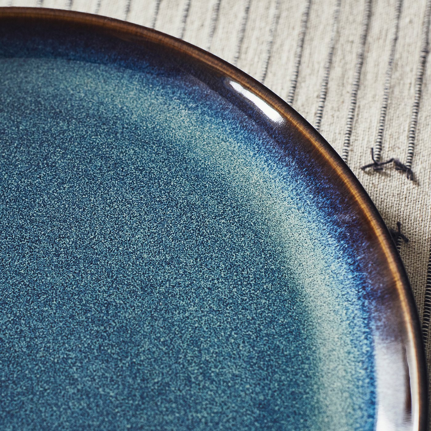 This ocean-blue, glazed plate, with golden-brown details, turns every meal into pure joy. Decorate your table with clean classic shapes and a strong crafted look. A timeless feel with a unique design.