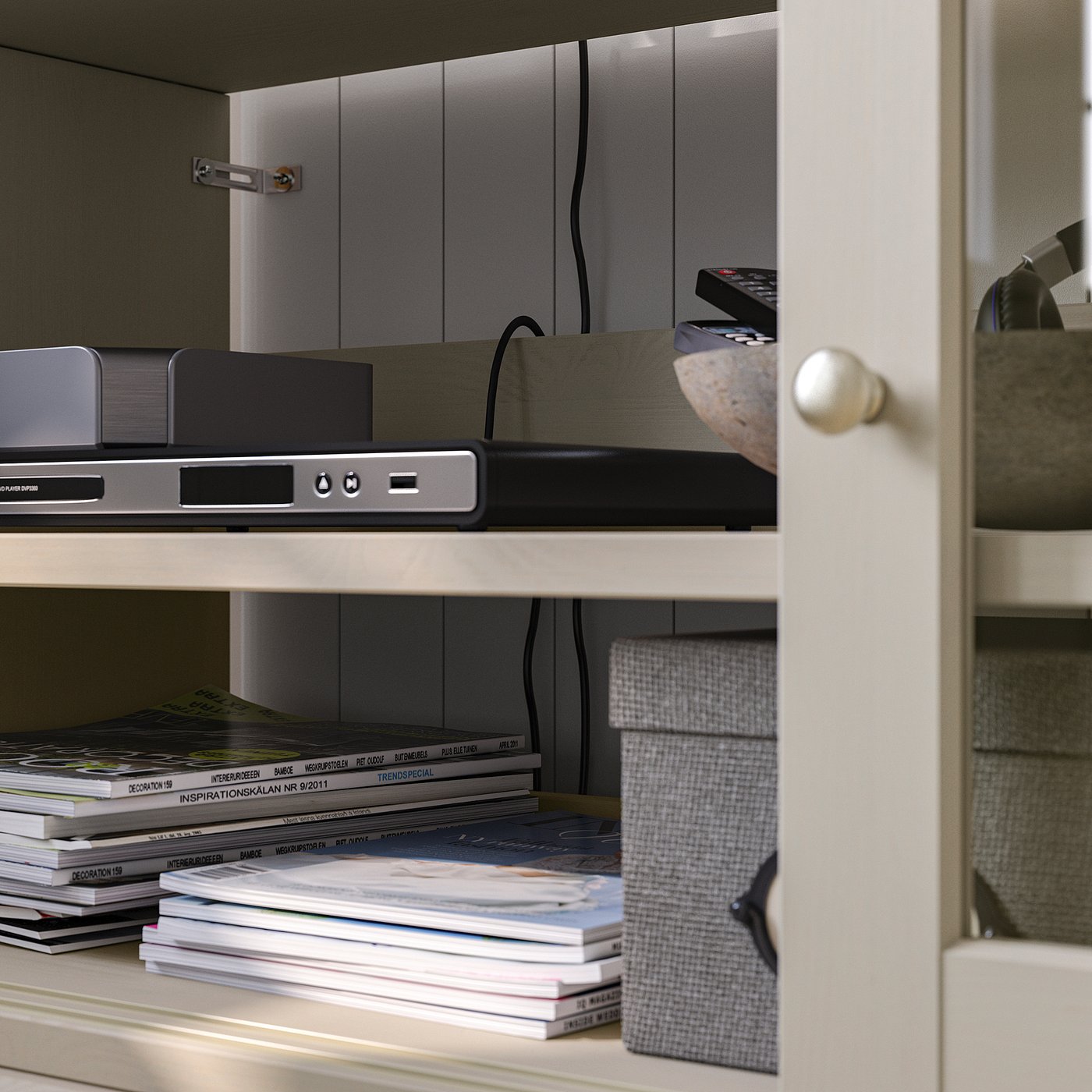 Carefully designed details in solid pine with a brushed surface adds a rustic feel and charm to your home. This combination helps you organize the space around your TV and keep unruly cables hidden.