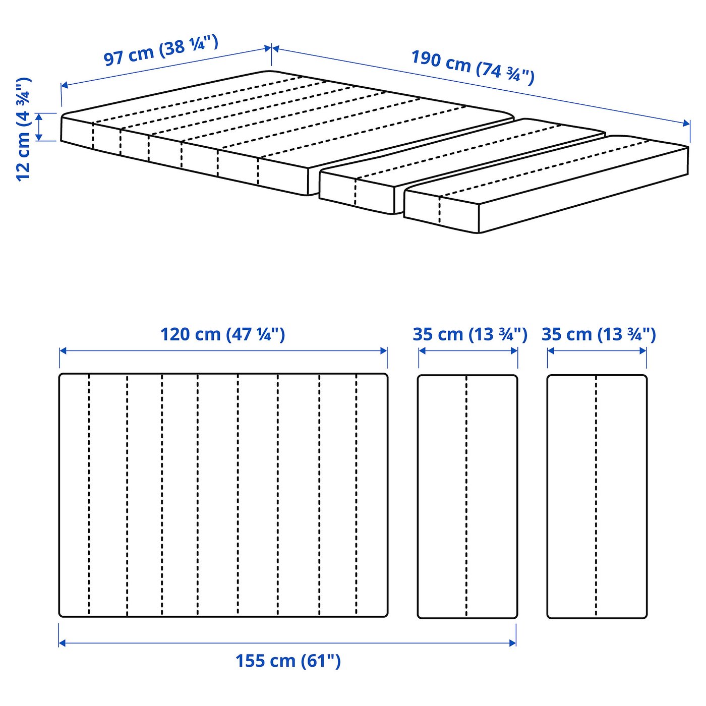 One mattress ‒ three lengths. With the help of the 2 extendable parts, the mattress can grow with your child, from 47" to 61" or 74¾".