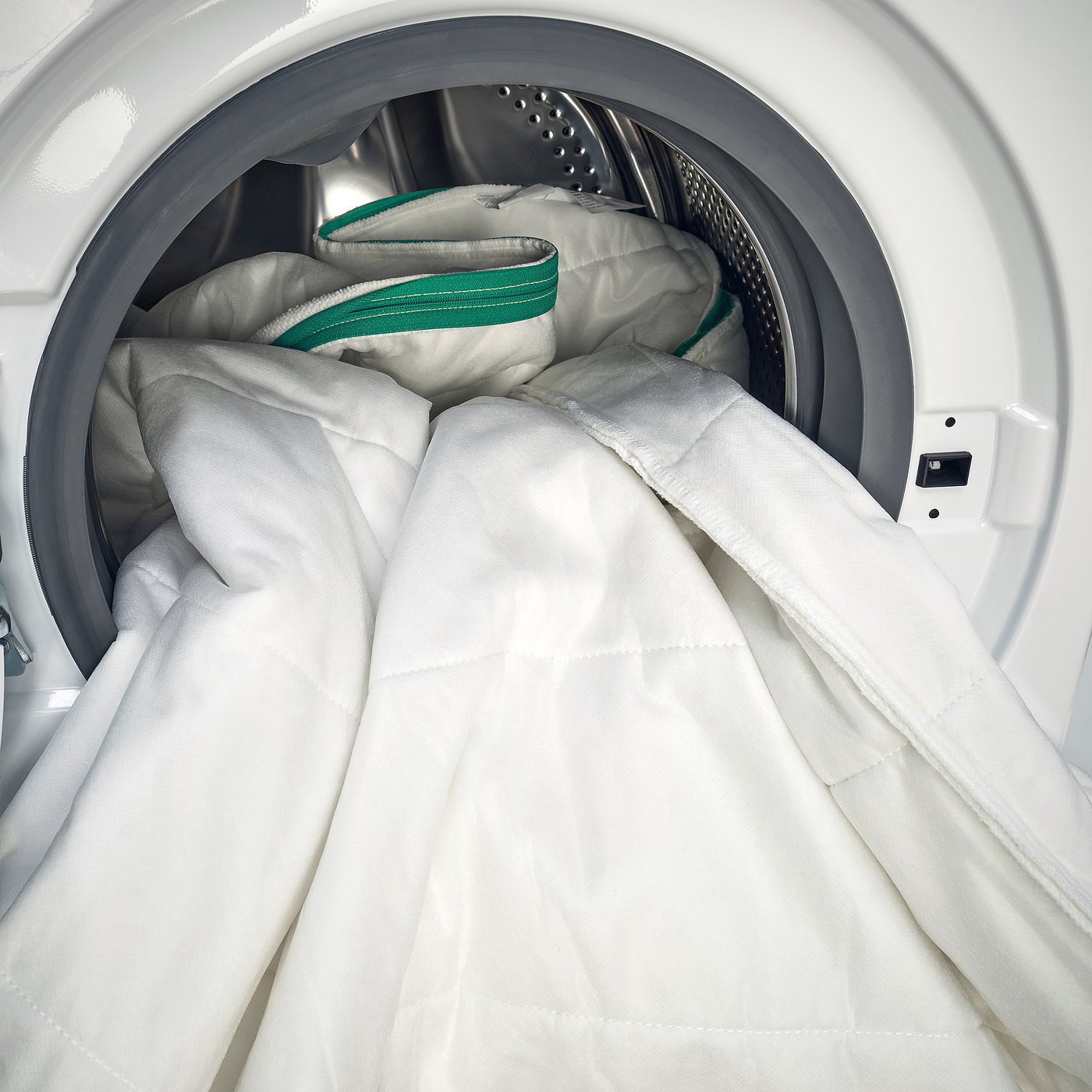 The outer cover is easy to remove and is machine washable at 140°F (Hot).