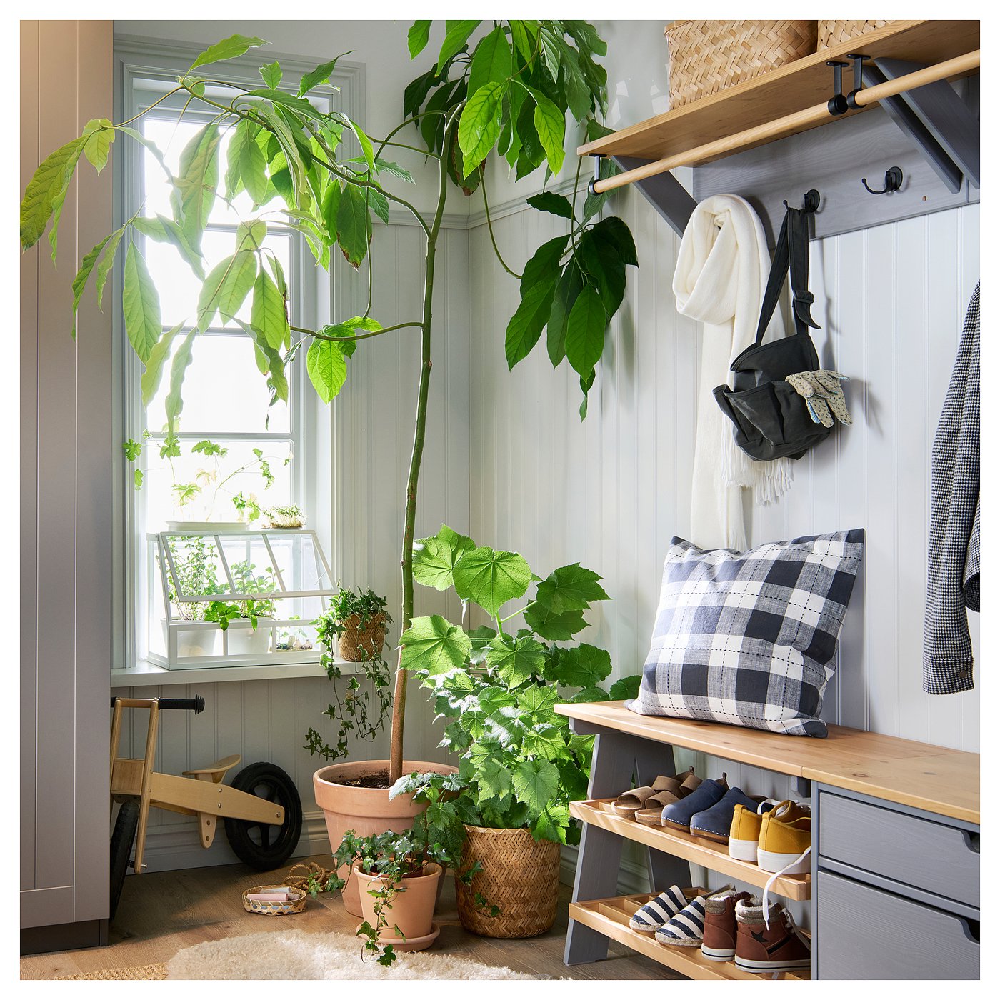 The KALLSÖ series has welcoming hallway furniture with a crafted feel, timeless style and all those needed functions. The bench with shoe storage holds 6 pair of shoes – use several if you need more room!