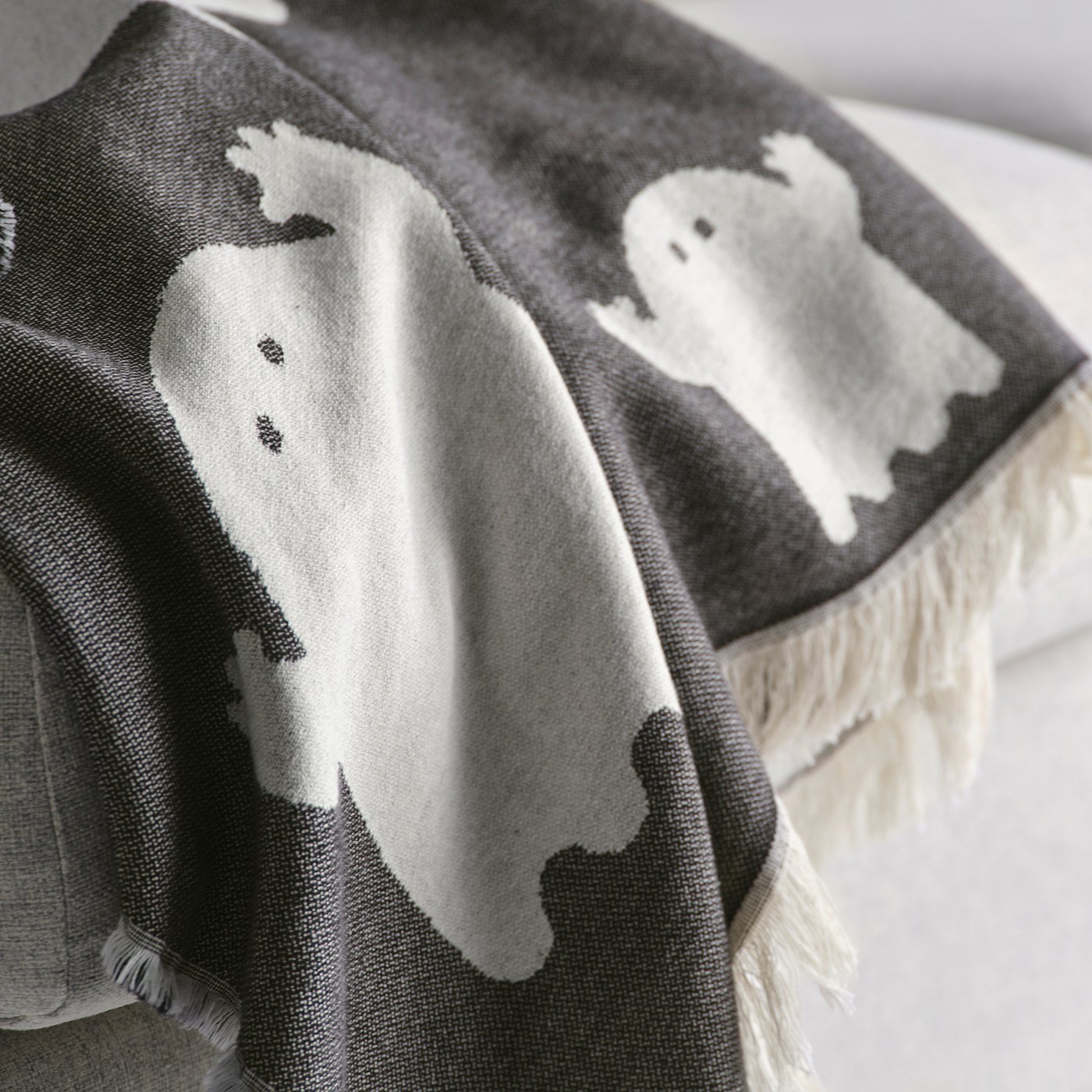 BOO! Let white and black ghosts create that right Halloween atmosphere. Made from soft cotton, this decorative throw with fringes is perfect for cuddling up under if real ghosts appear...