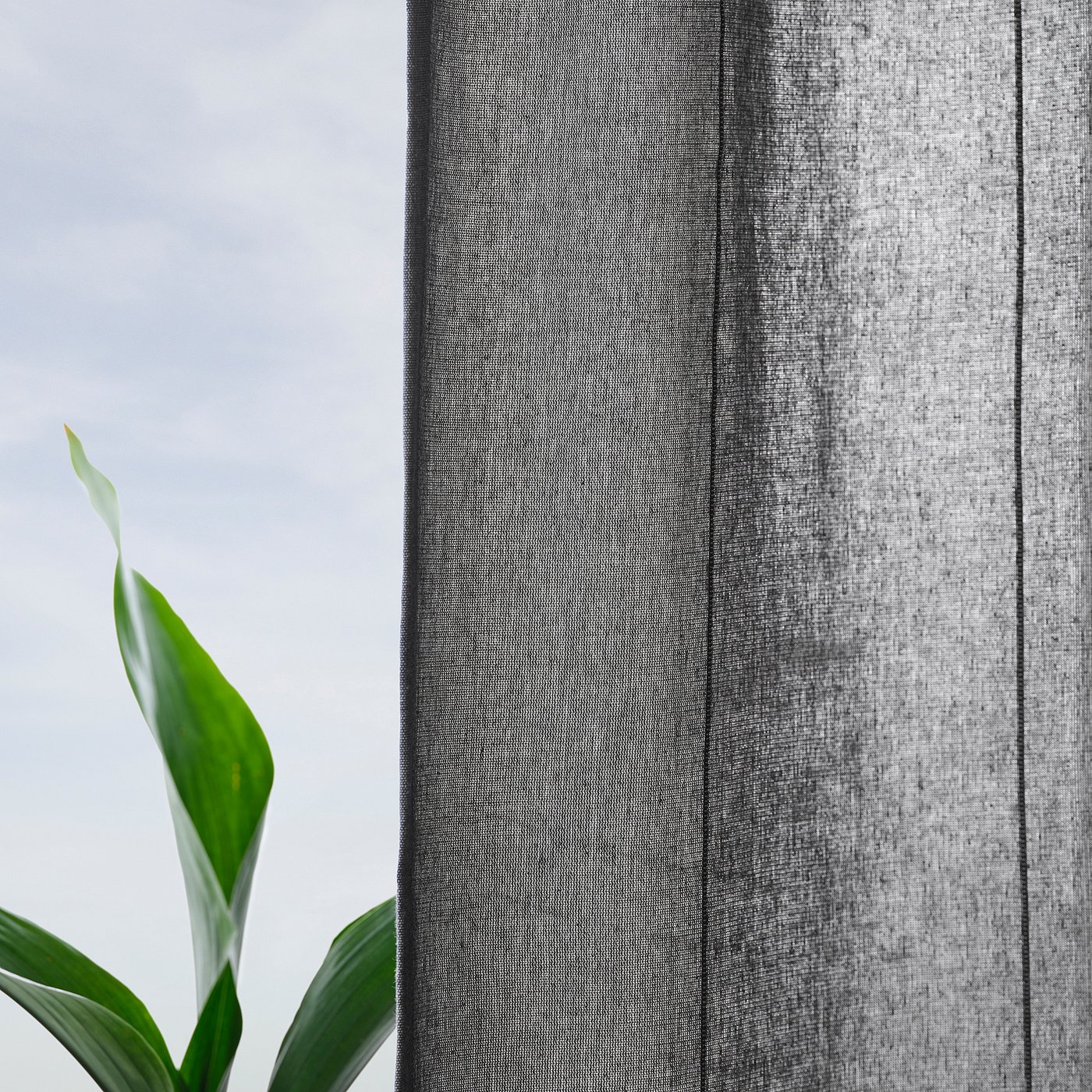 LENDA curtain in dark grey with header tape has a linear weave that adds character and gives the impression of a taller window. The tiebacks bring a decorative flair, showcasing the view outside.