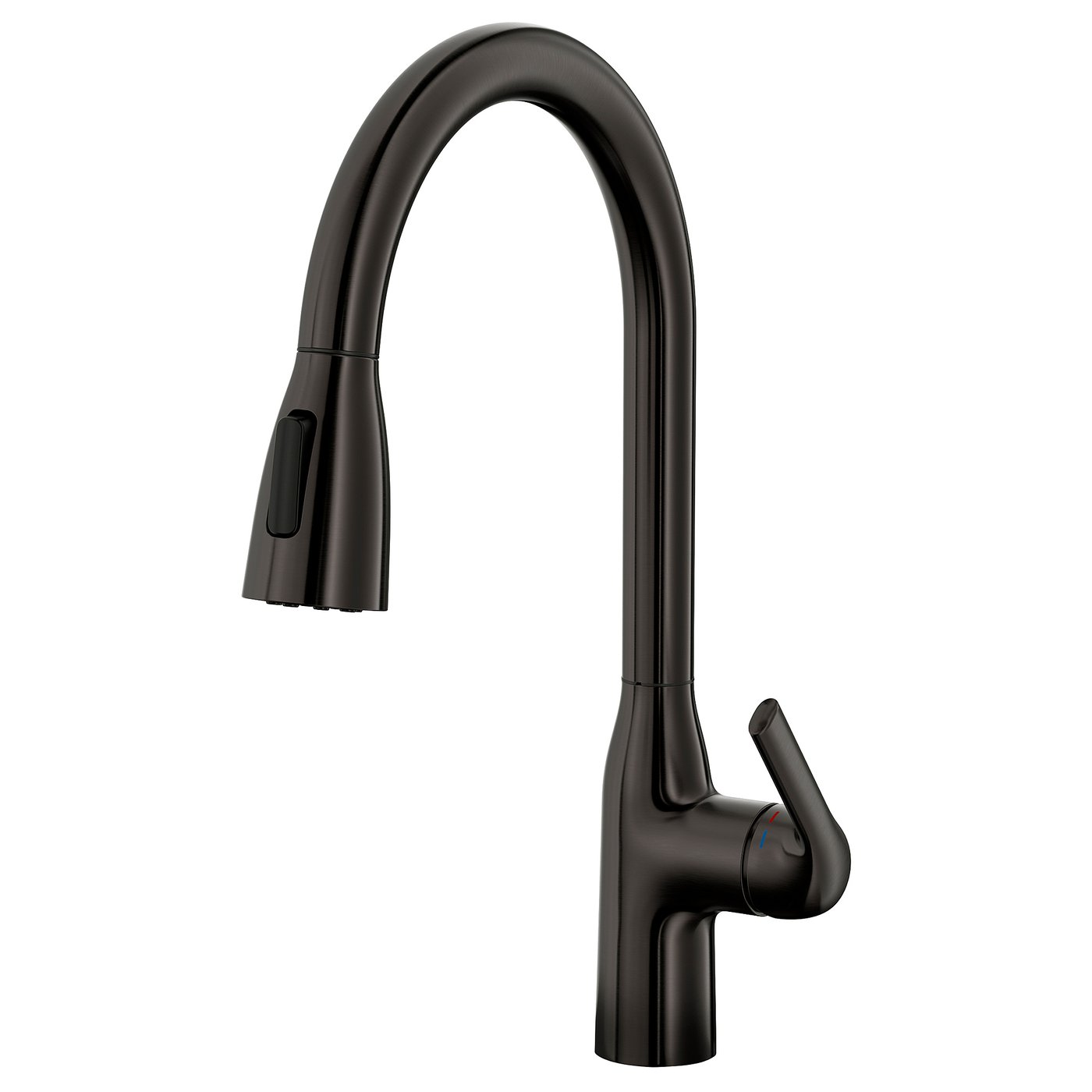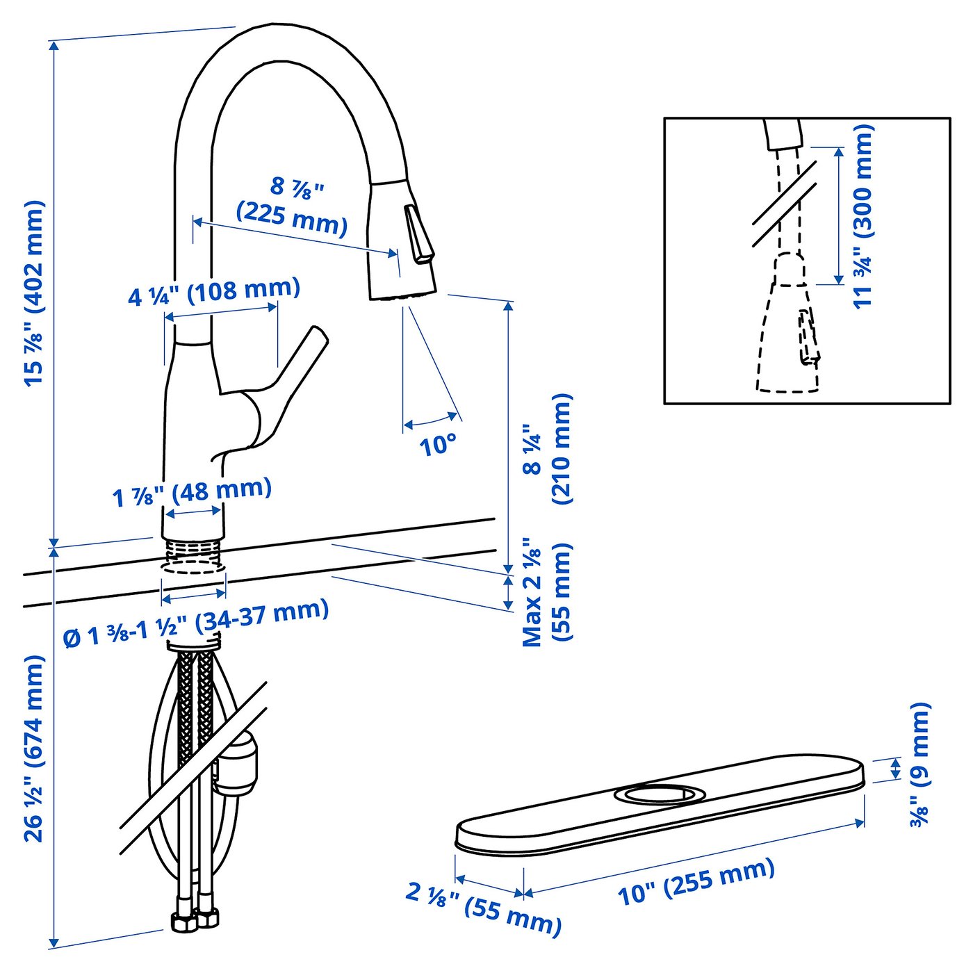 This MACKSJÖN kitchen mixer faucet has a high-arc gooseneck spout with pull-down spray, offering both aerated stream and powerful spray, for easy cleaning or food prep in all corners of your sink.