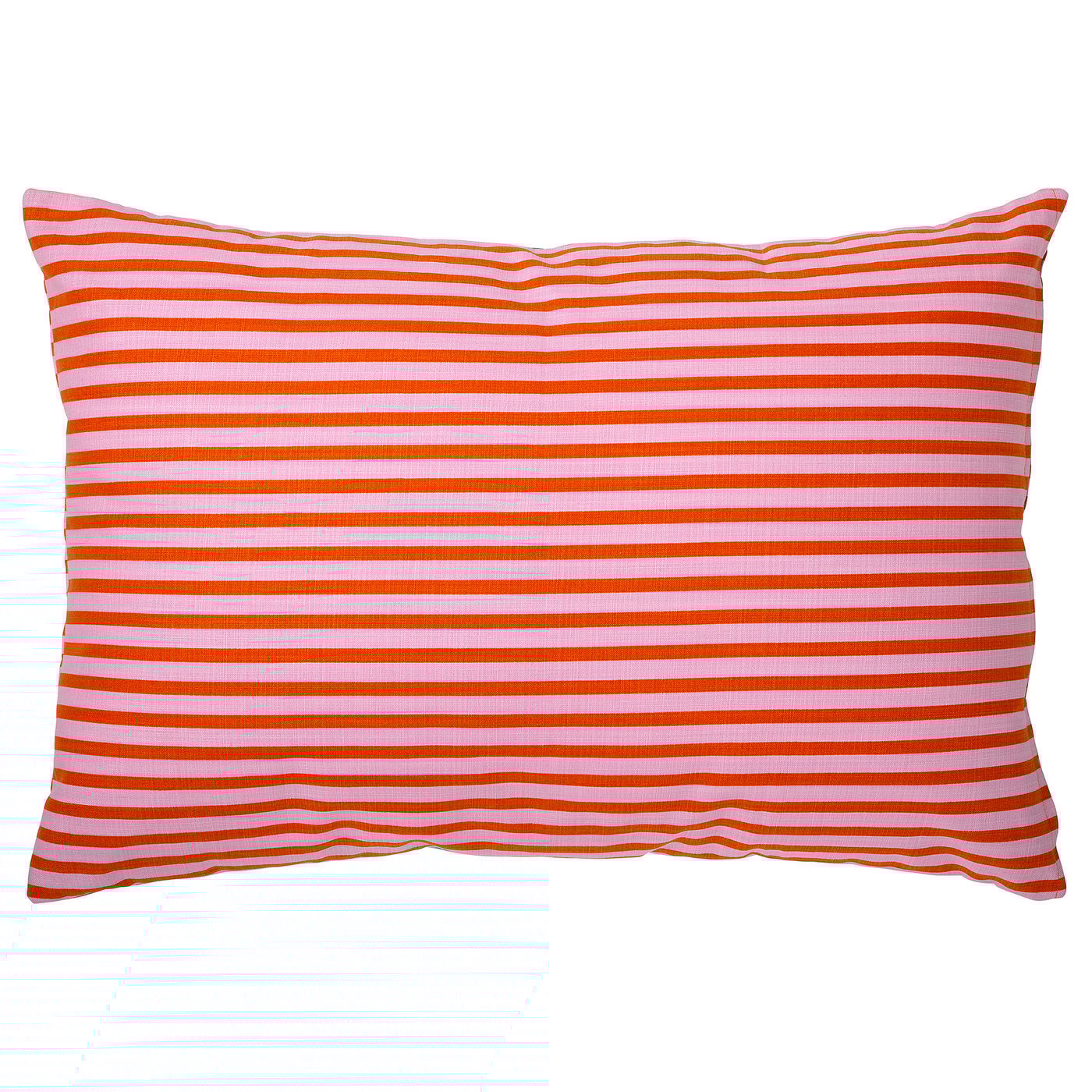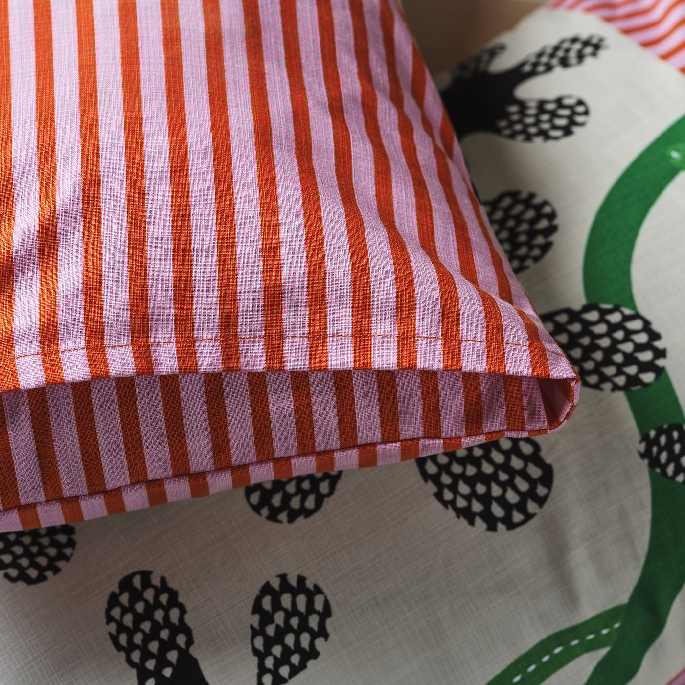 Cushion cover with a printed pattern combined with embroidery and vertical stripes in pink and orange on the sides. A modern-styled traditional craft that matches other textiles in the MÄVINN collection.