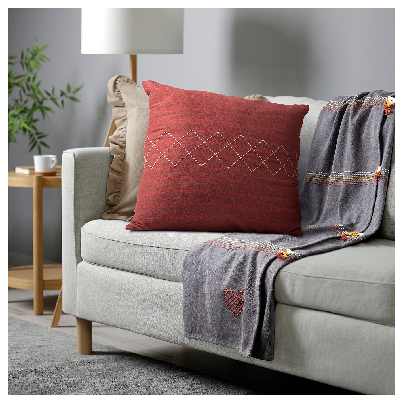 This red cushion cover with discrete stripes and a hand-embroidered geometric pattern spreads a warm feeling in your home – and provides livelihood for the artisans at the Indian social business Rangsutra.
