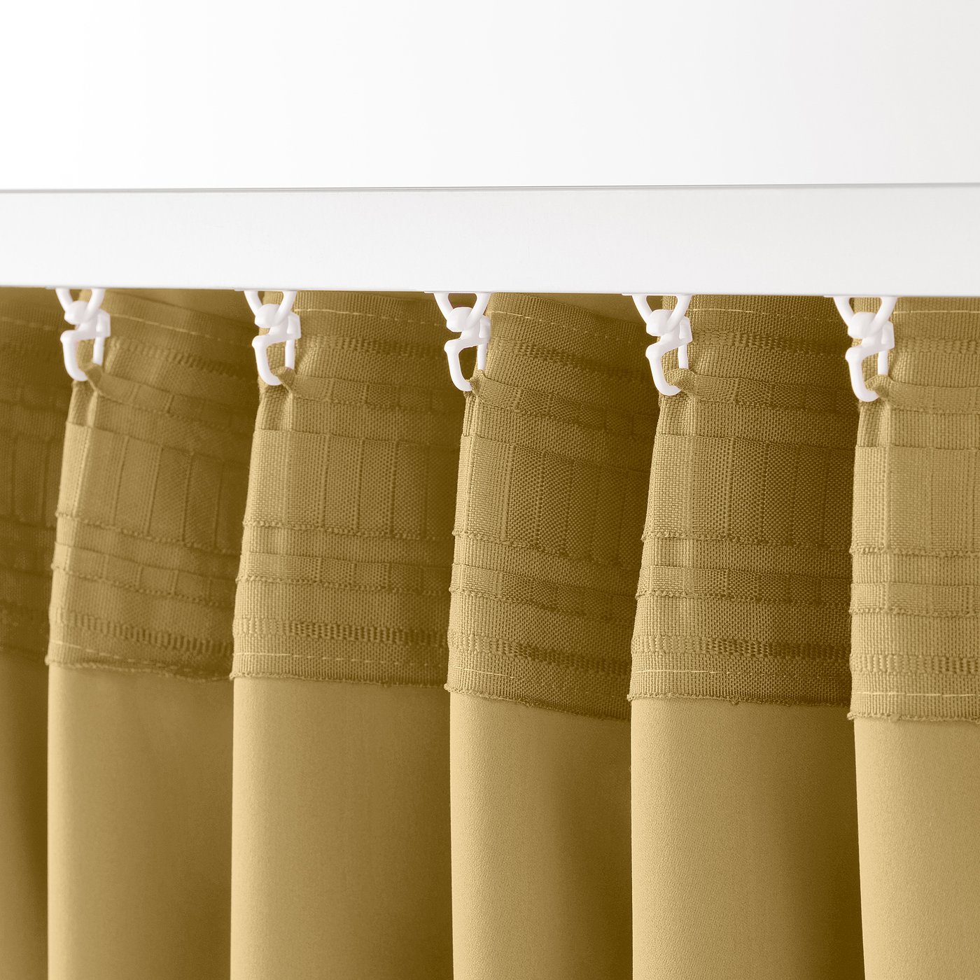 MAJGULL room darkening curtains in beige-yellow have a chic, butter-soft texture. The pleats fall beautifully and the fabric offers privacy during the day. Multi-way header for different hanging options.