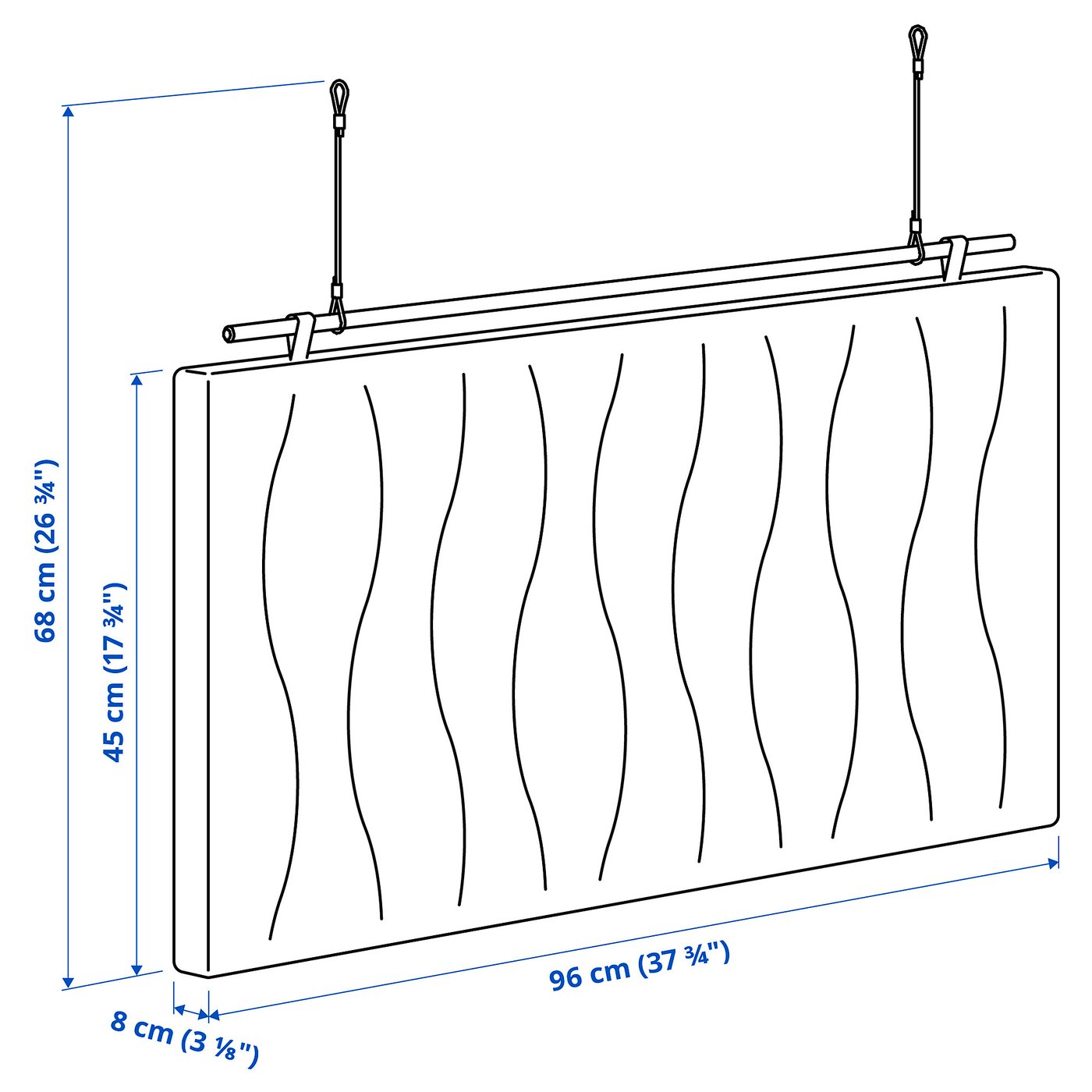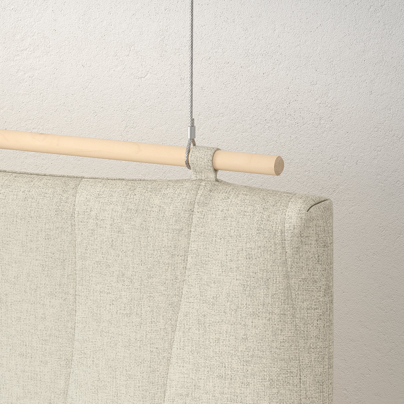 Slip the wooden rod through the fabric loops and attach the included metal strings to hang from ceiling.
