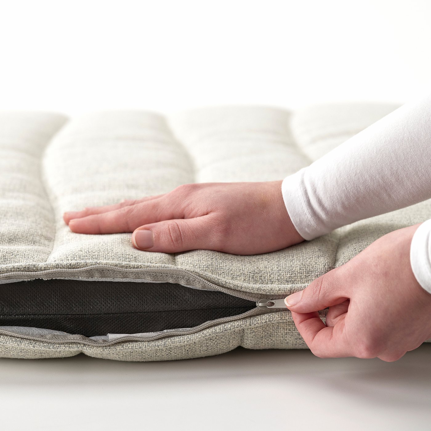 Machine wash warm, normal cycle. Turn the cover inside out and zip up before washing. Do not bleach. Do not tumble dry. Dry clean any solvent except trichloroethylene. Clean by carefully vacuuming from the outside. Only iron on the front side.