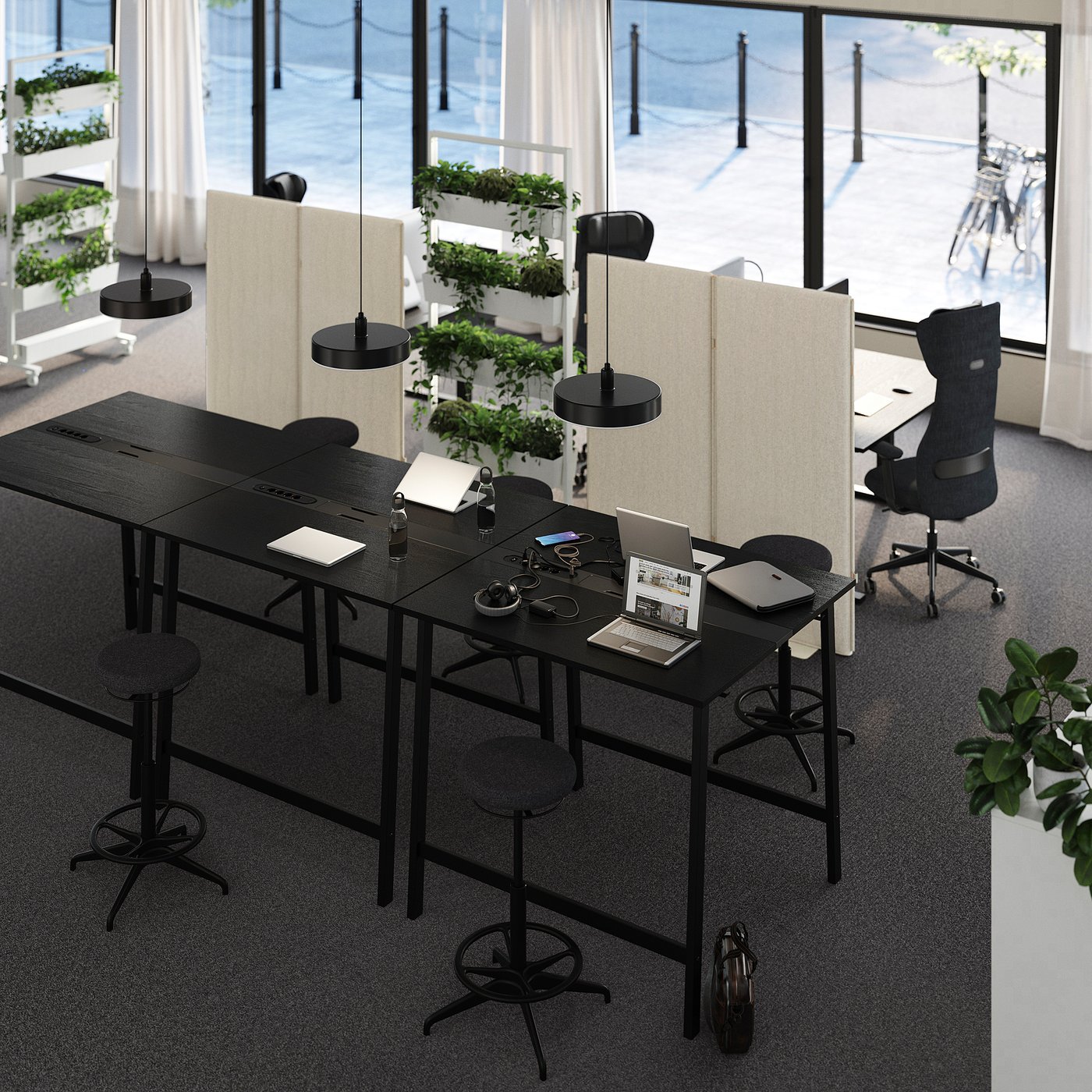 High conference table for sitting or standing with comfy footrest for added support. Perfect for morning touch base or longer meetings. Clever cable management allows you to stay plugged in.