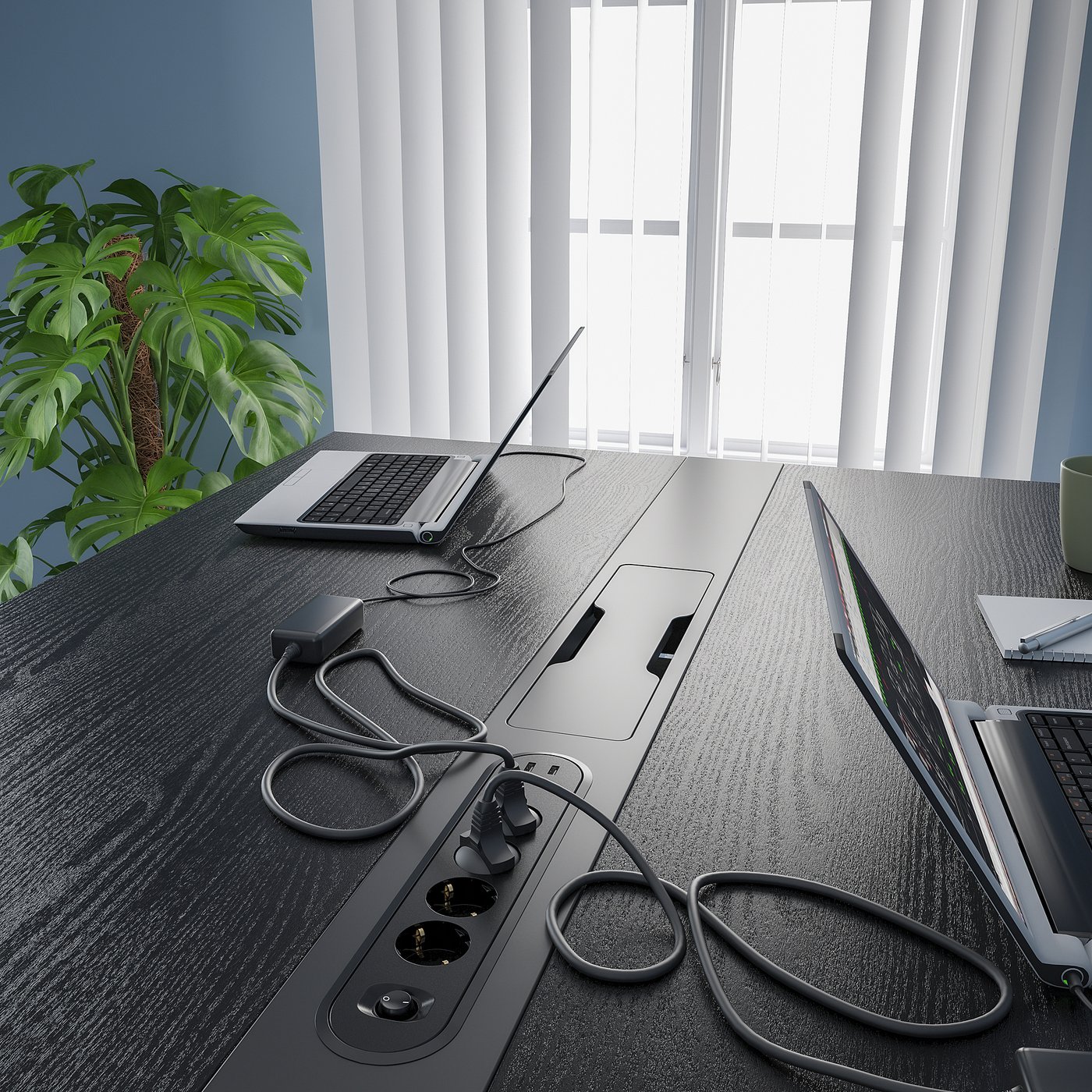 Cable management module included so you can stay charged while working. Compatible with all outlets globally, accessible from above.