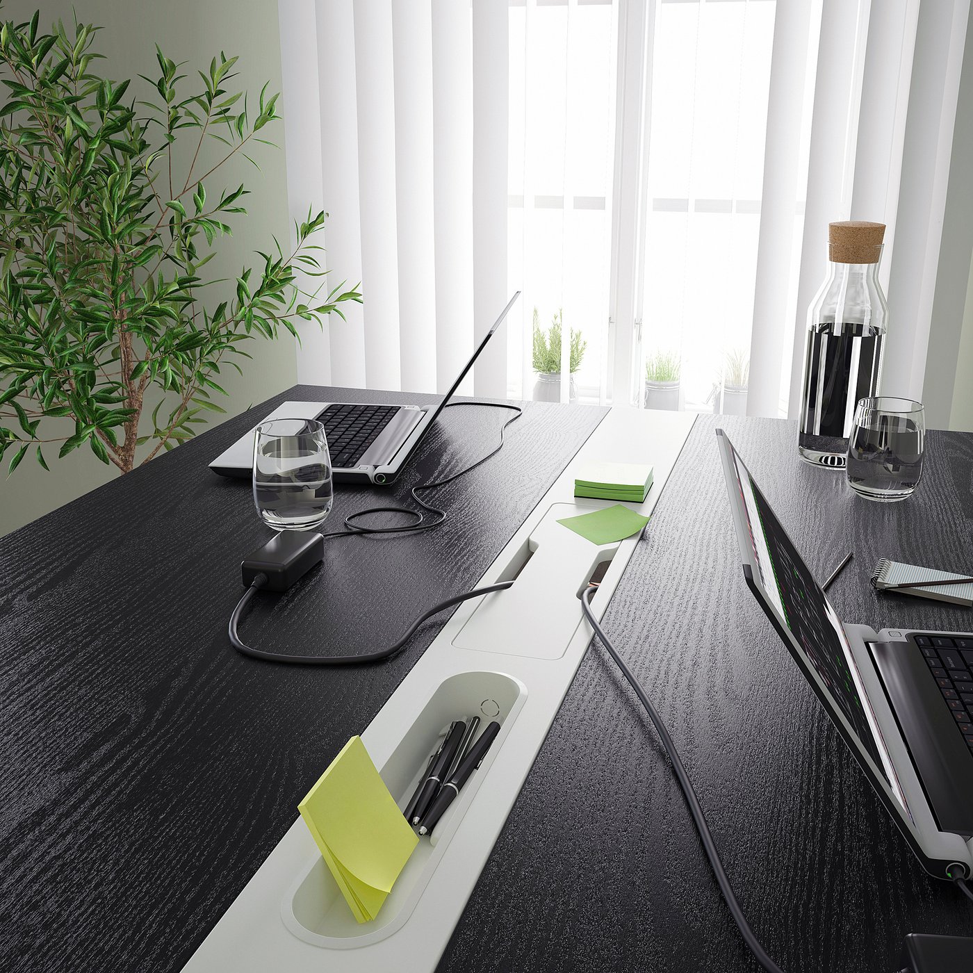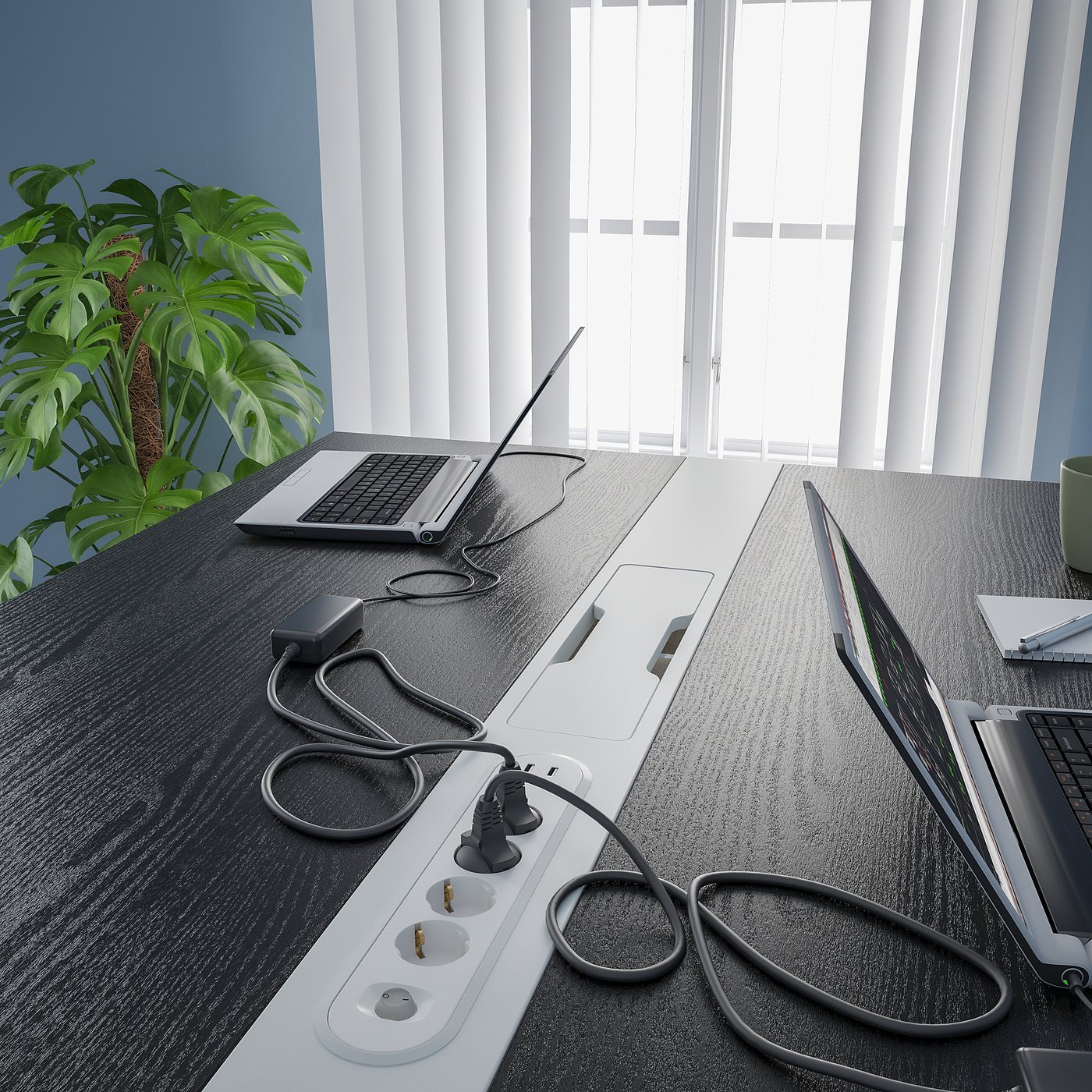 Cable management module included so you can stay charged while working. Compatible with all outlets globally, accessible from above.