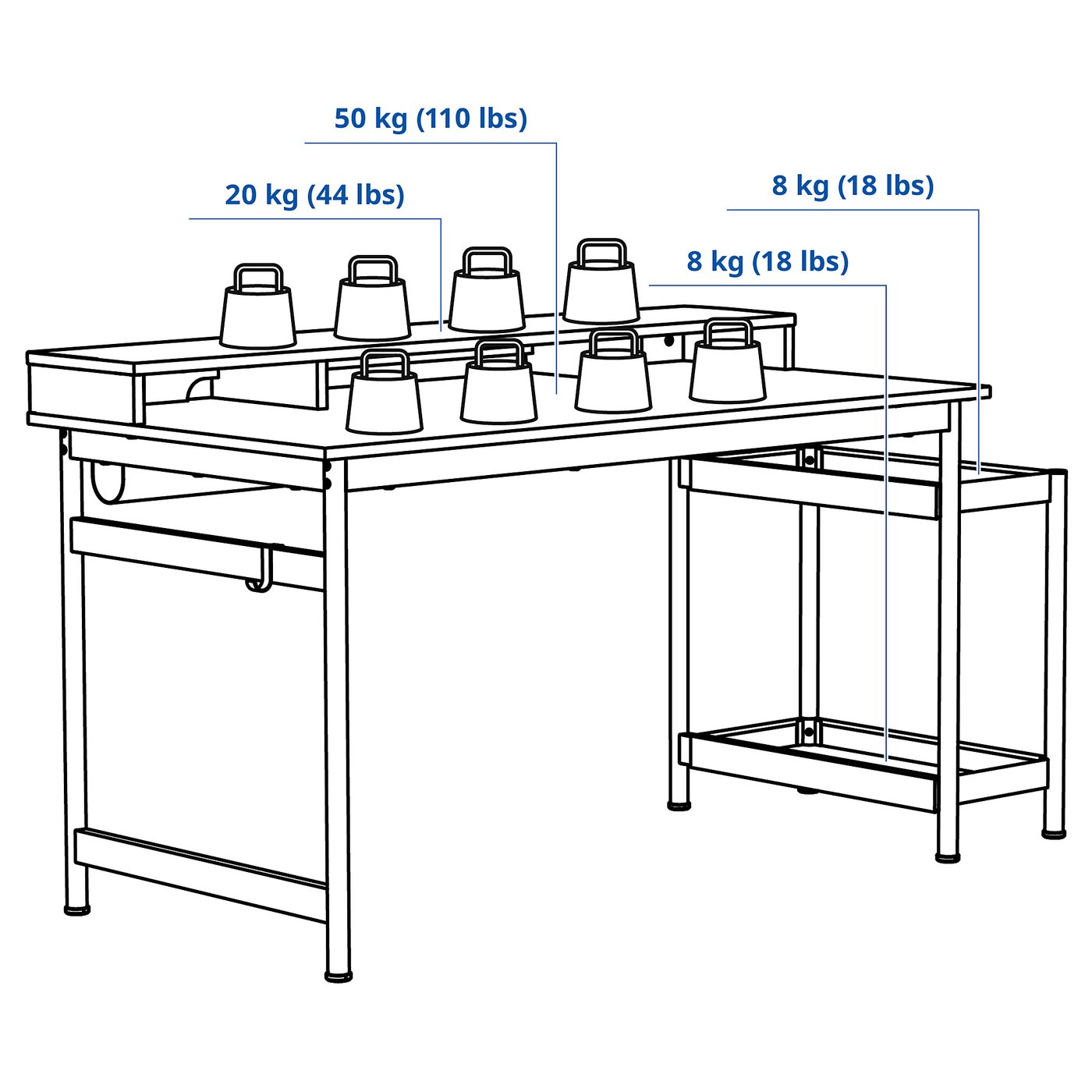 The desk has an add-on unit where you can place a computer screen on top and compartments with space for paper and boxes for desk accessories and other smaller items.