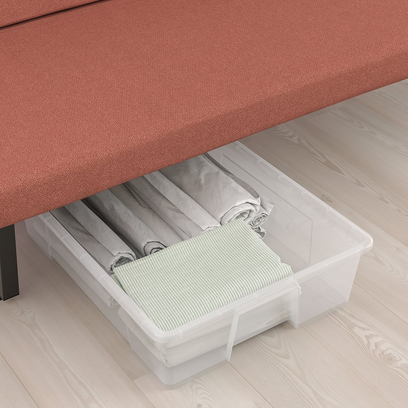 The space under the sofa is designed to fit storage boxes where you can store bed linen, etc.