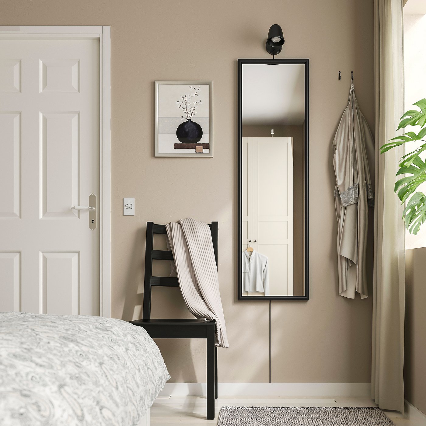 A mirror on the wall helps add depth to a room and makes it more dynamic.