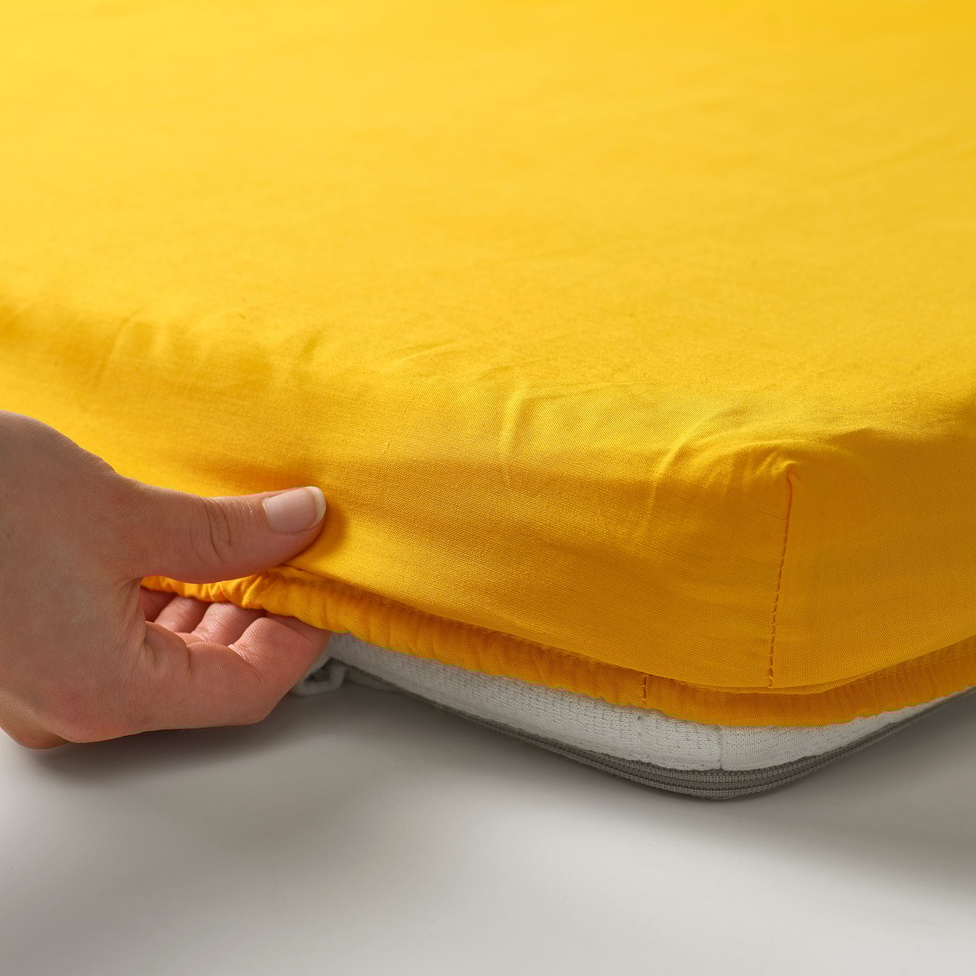 The pattern on this bedlinen set looks like both eggs and flowers and creates a playful expression in your child's cot together with the matching sunny-yellow fitted sheet.