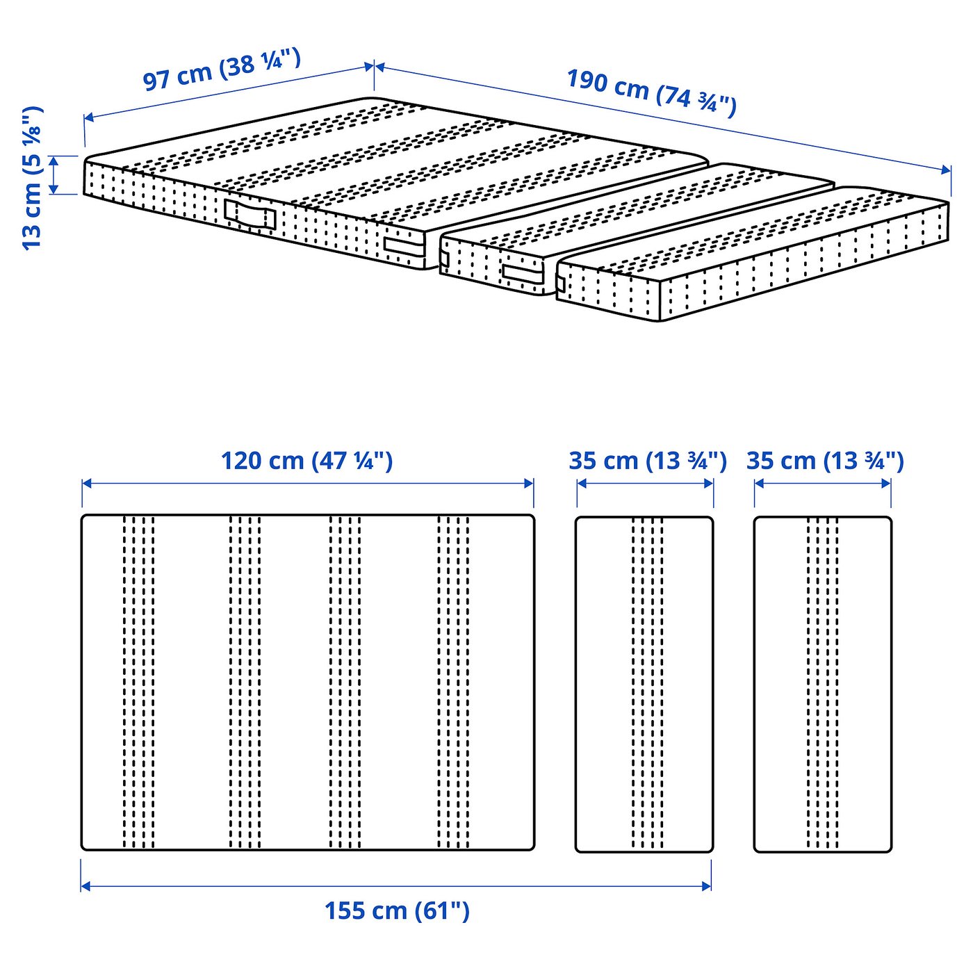 One mattress ‒ three lengths. With the help of the 2 extendable parts, the mattress can grow with your child, from 47" to 61" or 74¾".