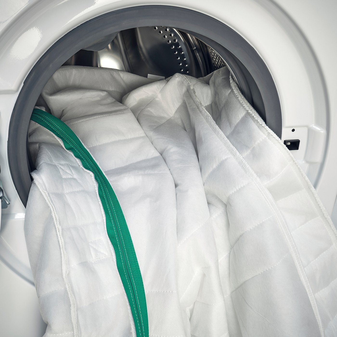 The outer cover is easy to remove and is machine washable at 140°F (Hot).