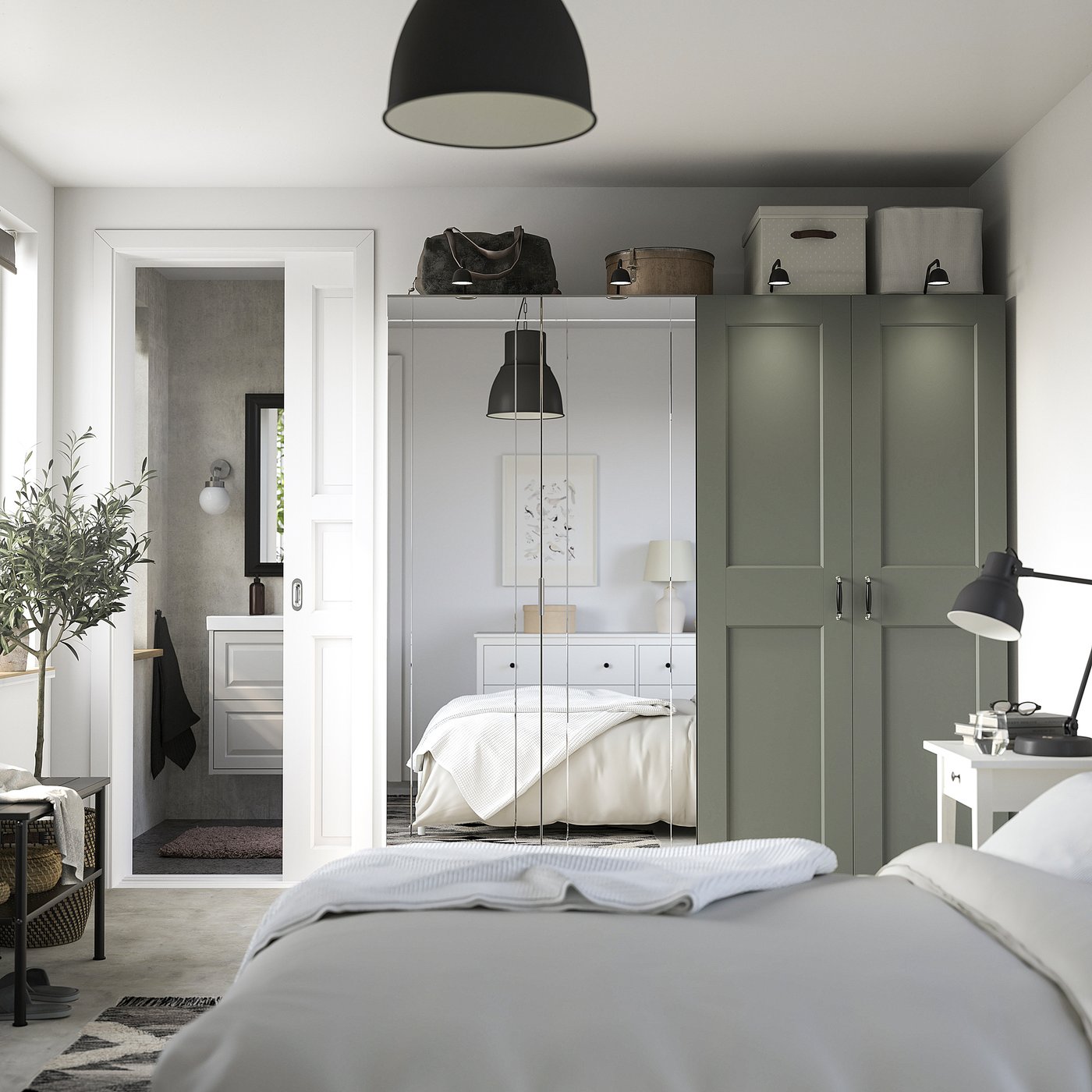 The soft grey-green shade of the doors brings a piece of nature's harmonious color scale into your space and creates a calm feeling that feels relaxing.