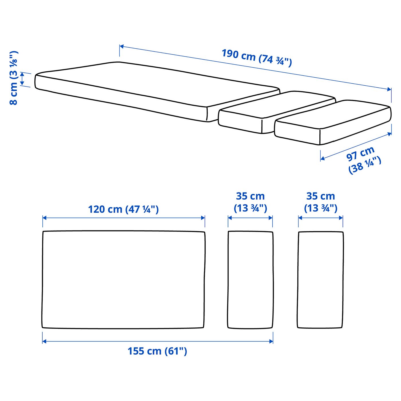 One mattress ‒ three lengths. With the help of the 2 extendable parts, the mattress can grow with your child, from 47" to 61" or 74¾".
