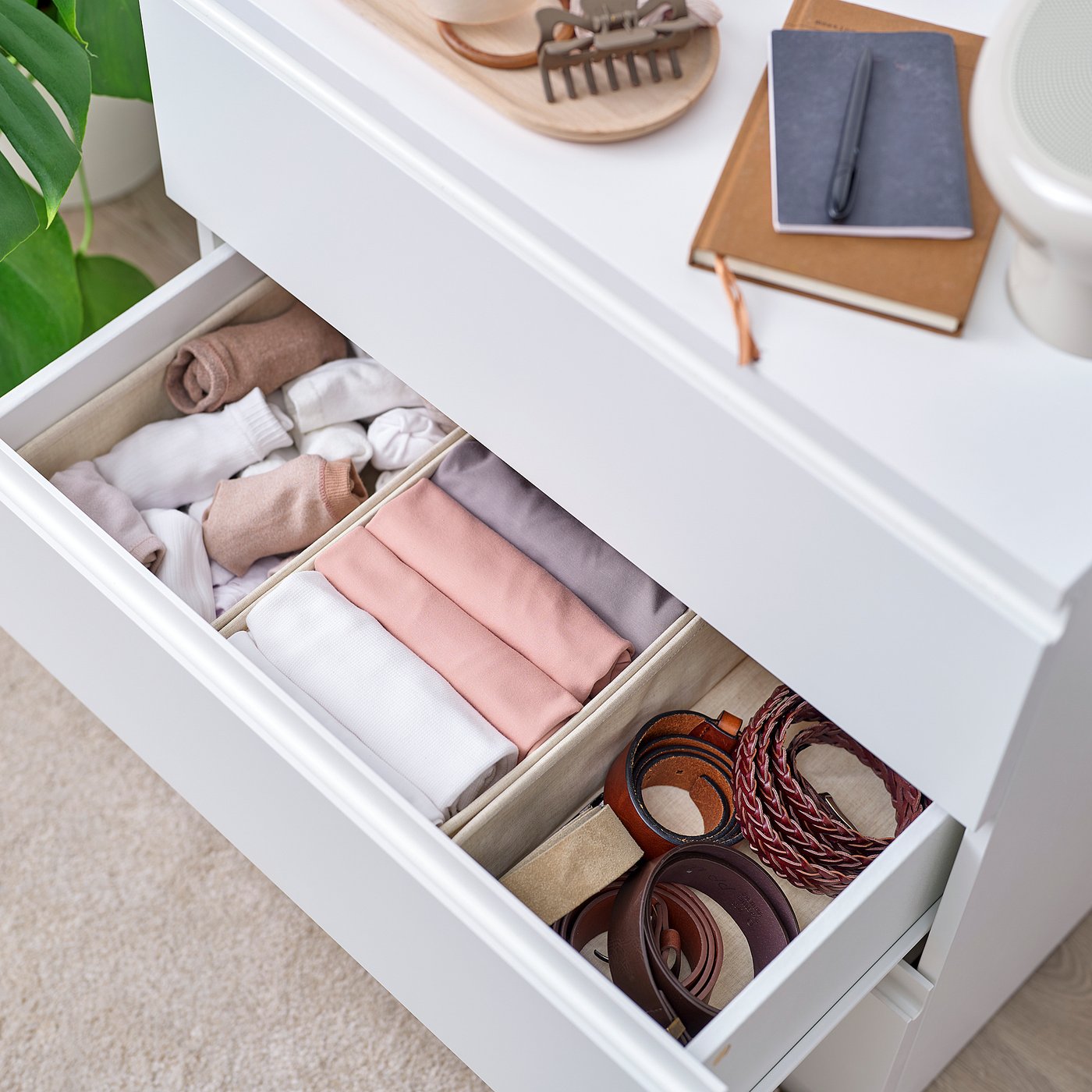 These small linen-like fabric boxes are both decorative and practical, helping you organise socks, lingerie, and accessories. Use one or several in each drawer, depending on your needs.