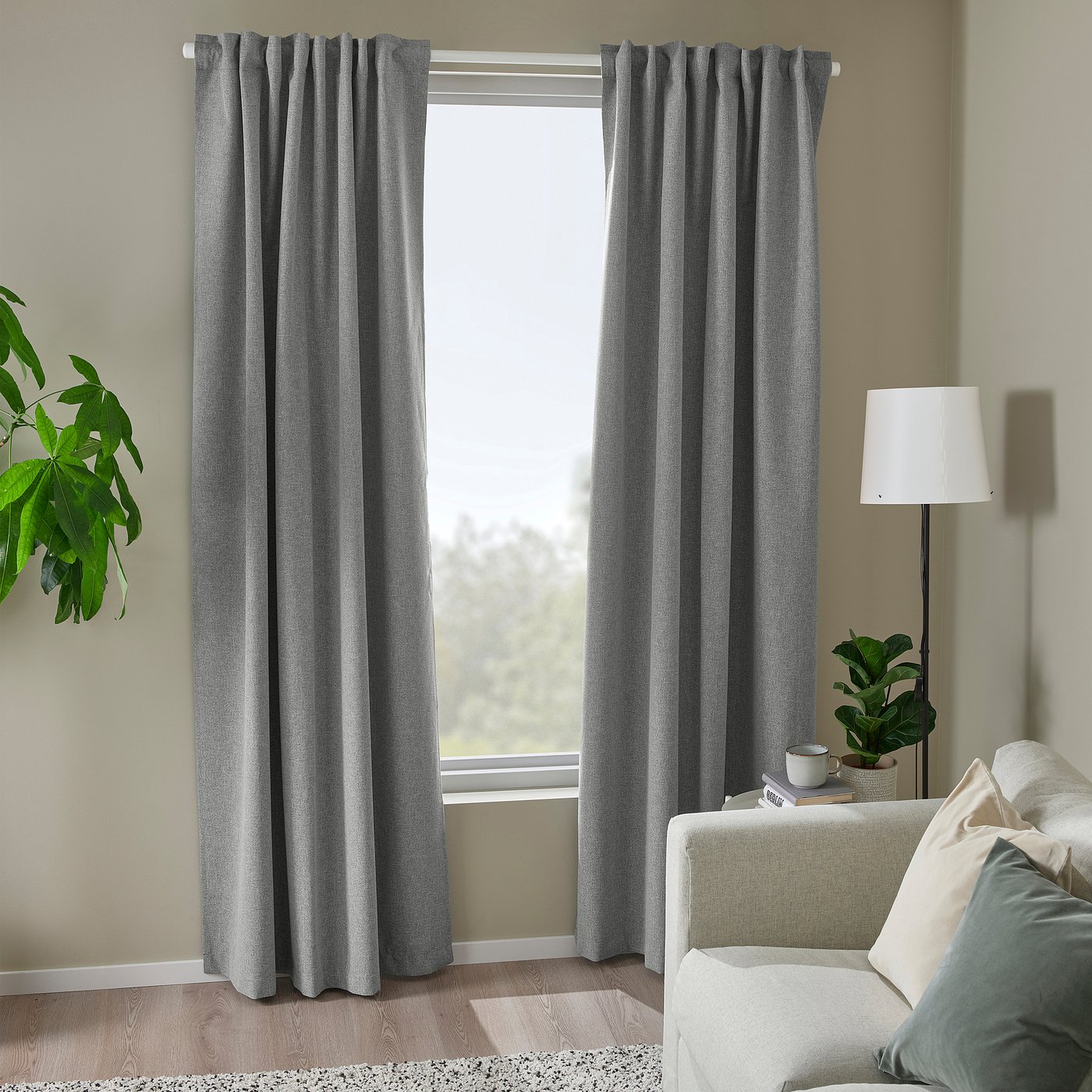 ROSENMANDEL black-out curtain in grey wool-like mélange effect creates a peaceful ambiance in your living room or bedroom without feeling heavy. Pairs easily with sheer curtains and other textiles.