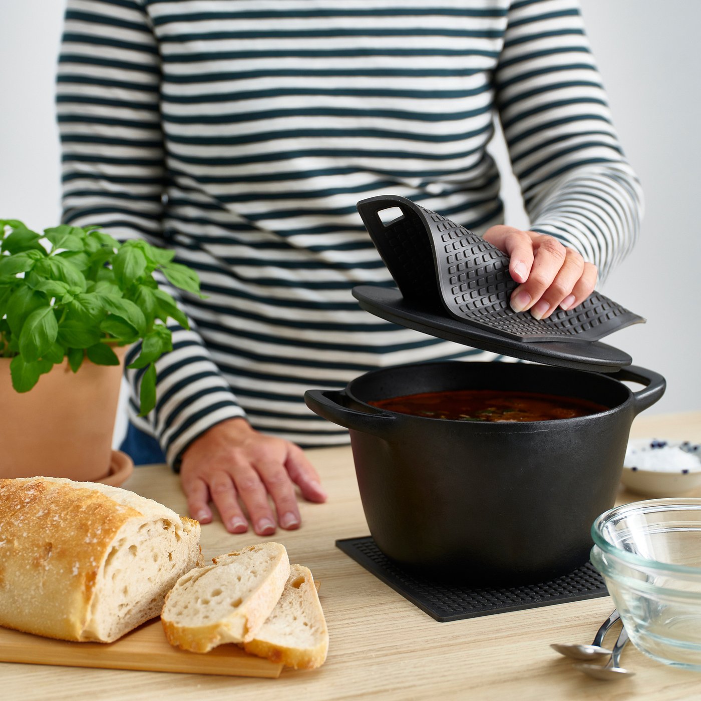 This pot holder is made of strong silicone that protects your hands from heat and provides a safe and secure grip. It can also be used as a trivet and is easy to clean in the dishwasher.