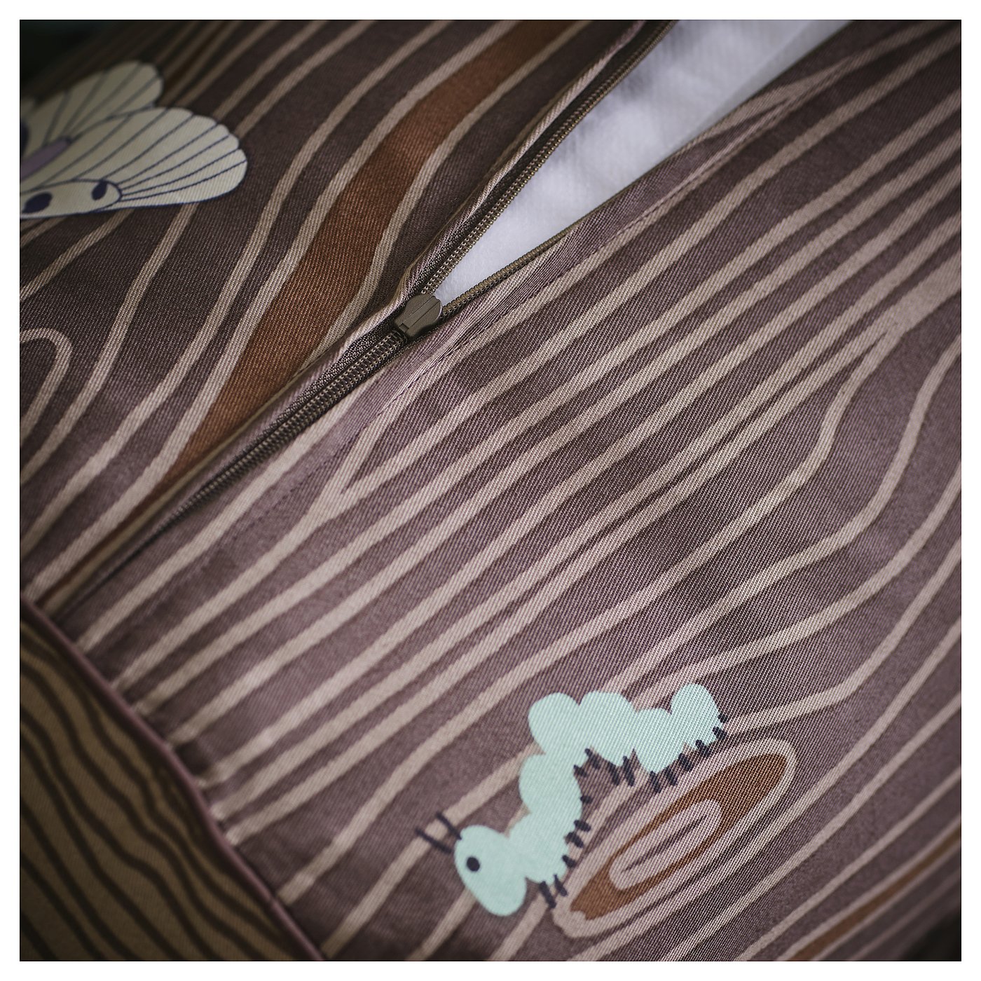 This cylinder-shaped cushion looks like a tree trunk and gives your child nice support for the head, lower back, arms or knees – on the bed or the floor. Do you recognize the insects crawling on the bark?