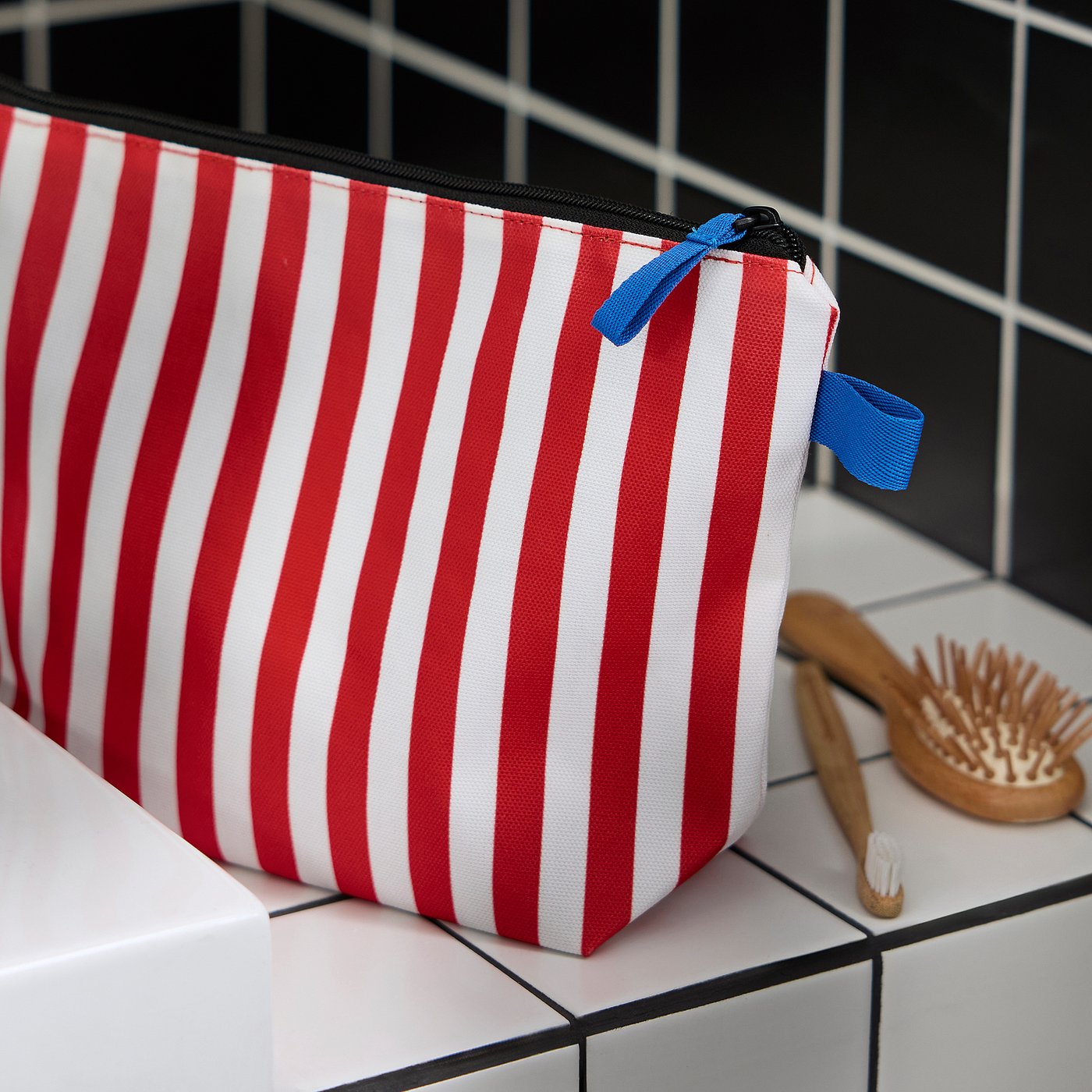 Get yourself off to a perky start in the morning with SKOGSALLAT toiletry bag adorned with vibrant red and white stripes. 4 compartments for organizing, so you find things fast when you’re on the go.