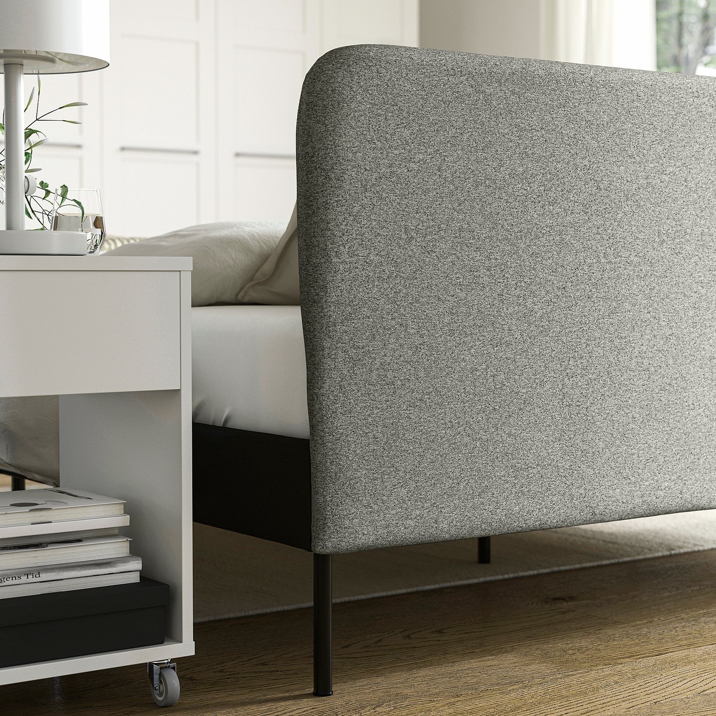 The grey/beige Öreryd fabric with a melange effect is made from at least 90 % recycled polyester and has a soft surface, making it even cosier to get into bed.