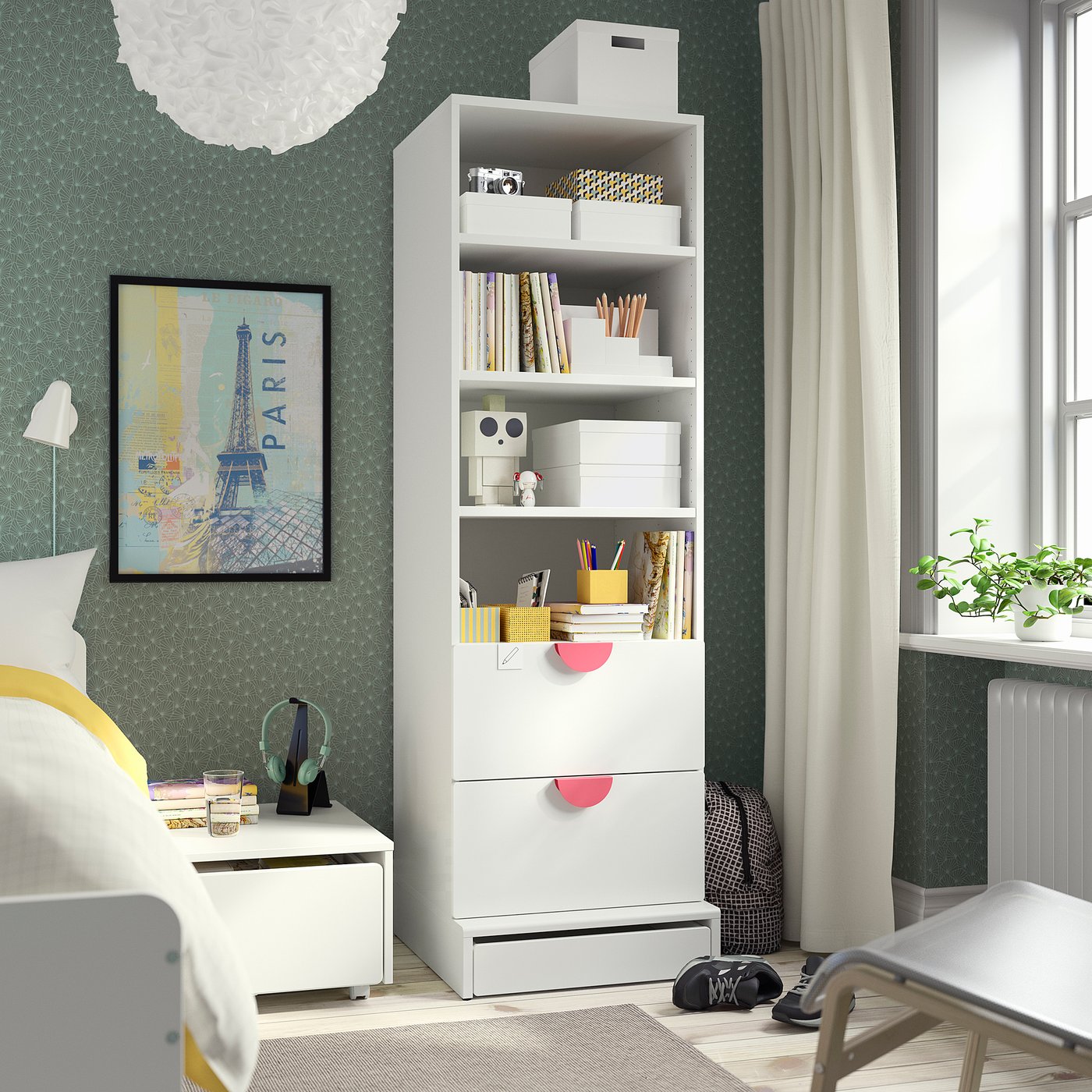 This bookcase has lots of storage in a small space – from baby years to teens. On the open shelves you can display and have things close at hand, and in the drawers there is room for things of all sizes.